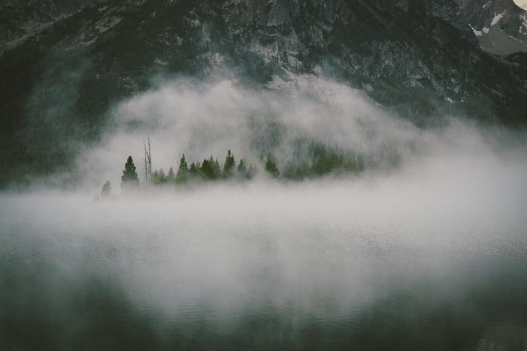 Keywords: fog haze hazy mountains hills peaks cliffs rocks trees water mist