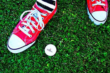 Keywords: foot standing sneakers grass golf ball golf sock striped female woman foot