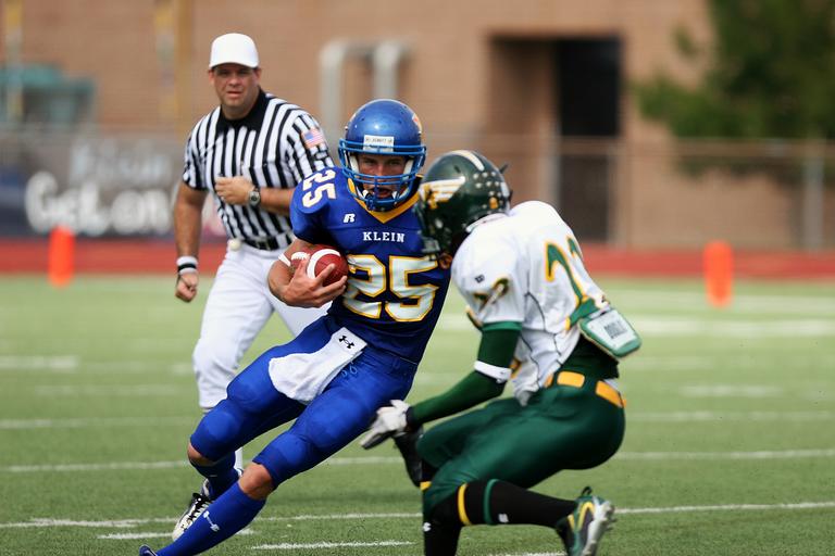 Keywords: football running back referee ball carrier american football field ball sport running gridiron halfback headgear run male player action defender competition competitor striped shirt stripes uniform helmet man high school texas