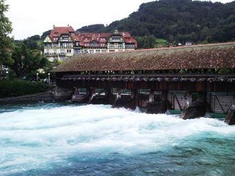 Keywords: footbridge gedekte bridge aarebrücke bridge river jam weir switzerland thun