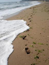 Keywords: footprints beach sand seaside sea water coast wave tracks
