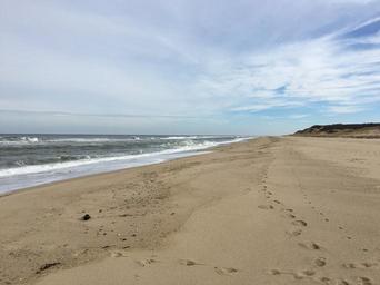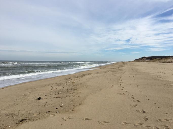 Keywords: footprints beach sky dunes waves water seashore seaside walk sand sea ocean tide line beach sand coast clouds sand dune sea foam