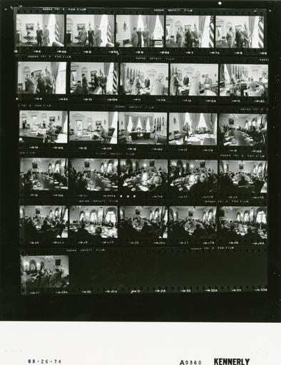 | Keywords: Ford A0360 NLGRF photo contact sheet (1974-08-26)(Gerald Ford Library).jpg White House Photographic Office WHPO is housed at the Gerald R Ford Presidential Library a branch of the National Archives and Records Administration NARA <br/><br/> This file is a 200 dpi photo contact sheet having images from roll of film A0360 of the August 9 1974 - January 20 1977 Gerald R Ford White House Photographic Office Series A0001-A9999 and B0001-B2886 photographs <br/><br/> The date on the photo contact sheet is the date the roll of film was processed not necessarily the date the photographs were taken See table below for additional details 1974-08-26 Gerald R Ford Presidential Library Image http //www fordlibrarymuseum gov/library/whphotos/A0360_NLGRF jpg A0360_NLGRF jpg from http //www fordlibrarymuseum gov/library/whphotos/19740826whpo pdf White House Photographs August 26 1974 of the http //www fordlibrarymuseum gov/Library/whphotos/whpo asp White House Photographic Collection page White House Photographic Office WHPO <br/> Creator David Hume Kennerly PD-USGov Institution Institution Gerald R Ford Presidential Library Table wikitable sortable + Photo contact sheet A0360 U S President Ford Administration Gerald R Ford Library Frame s Tone Subject proper Subject generic Names Geographic Location Photographer Date - 4 BW United States Ambassador-designate to Cyprus standing talking GRF William R Crawford Jr Oval Office Kennerly 1974-08-26 - 5-10 BW United States Ambassador-designate to Cyprus standing talking GRF William R Crawford Jr Kissinger Oval Office Kennerly 1974-08-26 - 11-13 BW Economic Advisors standing talking GRF Hartmann Siedman Rush Oval Office Kennerly 1974-08-26 - 14-15 BW Economic Advisors seated talking GRF Siedman Oval Office Kennerly 1974-08-26 - 16 BW Economic Advisors seated talking GRF Siedman Rush Oval Office Kennerly 1974-08-26 - 17 BW Executive Director Conference on Inflation GRF seated Sideman standing GRF Siedman Oval Office Kennerly 1974-08-26 - 18-29 BW Cabinet Meeting seated around table - all not in every frame GRF Rockefeller Secs Kissinger Schlesinger Simon Saxbe Morton Butz Dent Brennan Weinberger Lynn Brinegar; Ash Armstrong Burch Rush Marsh Hartmann Scali Greenspan Seidman Cabinet Room Kennerly 1974-08-26 Gerald R Ford Presidential Library and Museum-cooperation PD-USGov Contact sheets by the Ford White House August 1974 Photographs by David Hume Kennerly from 1974 Conference on Inflation 1974 |