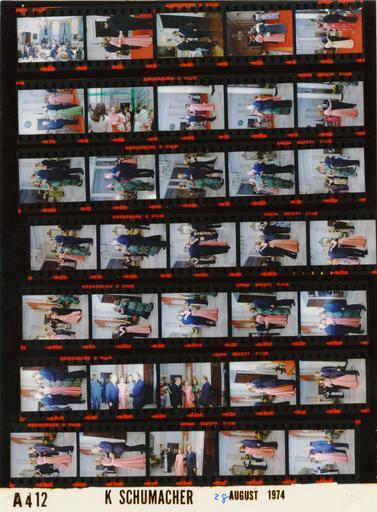 | Keywords: Ford A0412 NLGRF photo contact sheet (1974-08-28)(Gerald Ford Library).jpg White House Photographic Office WHPO is housed at the Gerald R Ford Presidential Library a branch of the National Archives and Records Administration NARA <br/><br/> This file is a 200 dpi photo contact sheet having images from roll of film A0412 of the August 9 1974 - January 20 1977 Gerald R Ford White House Photographic Office Series A0001-A9999 and B0001-B2886 photographs <br/><br/> The date on the photo contact sheet is the date the roll of film was processed not necessarily the date the photographs were taken See table below for additional details 1974-08-28 Gerald R Ford Presidential Library Image http //www fordlibrarymuseum gov/library/whphotos/A0412_NLGRF jpg A0412_NLGRF jpg from http //www fordlibrarymuseum gov/library/whphotos/19740828whpo pdf White House Photographs August 28 1974 of the http //www fordlibrarymuseum gov/Library/whphotos/whpo asp White House Photographic Collection page White House Photographic Office WHPO - Schumacher PD-USGov Institution Institution Gerald R Ford Presidential Library Table wikitable sortable + Photo contact sheet A0412 U S President Ford Administration Gerald R Ford Library Frame s Tone Subject proper Subject generic Names Geographic Location Photographer Date - 2A Color Dinner for Cabinet and Senior White House Staff seated talking - all not in frame; BF wearing formal gown GRF Betty Ford; Secs Kissinger Simon Schlesinger Morton Butz Dent Brennan Lynn Brinegar; Armstrong Burch Rush Marsh Hartmann Scali Burns Haig Timmons Buchen terHorst Lukash Bush Rockefeller Scranton Siedman spouses; Saxbe Blue Room Schumacher 1974-08-28 - 3A Color Dinner for Cabinet and Senior White House Staff standing talking; BF wearing formal gown Betty Ford Rogers Morton White House Waiter Center Hall Schumacher 1974-08-28 - 4A Color Dinner for Cabinet and Senior White House Staff standing talking Burns Morton Center Hall Schumacher 1974-08-28 - 5A Color Dinner for Cabinet and Senior White House Staff standing talking; BF wearing formal gown Betty Ford Guests Center Hall Schumacher 1974-08-28 - 6A Color Dinner for Cabinet and Senior White House Staff standing talking; waiter working Scranton Marsh spouses White House Waiter Center Hall Schumacher 1974-08-28 - 7A Color Dinner for Cabinet and Senior White House Staff standing talking GRF Ash Guests Center Hall Schumacher 1974-08-28 - 8A Color Dinner for Cabinet and Senior White House Staff standing talking; BF wearing formal gown Betty Ford Guests Center Hall Schumacher 1974-08-28 - 9A Color Dinner for Cabinet and Senior White House Staff walking to dance floor; BF wearing formal gown Betty Ford Nelson Rockefeller Entrance Hall/Grand Hall Schumacher 1974-08-28 - 10A Color Dinner for Cabinet and Senior White House Staff dancing GRF Happy Rockefeller; Guests Entrance Hall/Grand Hall Schumacher 1974-08-28 - 11A Color Dinner for Cabinet and Senior White House Staff dancing; BF wearing formal gown Betty Ford Nelson Rockefeller; Guests Entrance Hall/Grand Hall Schumacher 1974-08-28 - 12A-18A Color Dinner for Cabinet and Senior White House Staff dancing GRF Happy Rockefeller; Guests Entrance Hall/Grand Hall Schumacher 1974-08-28 - 19A-22A Color Dinner for Cabinet and Senior White House Staff dancing; BF wearing formal gown Betty Ford Nelson Rockefeller; Guests Entrance Hall/Grand Hall Schumacher 1974-08-28 - 23A Color Dinner for Cabinet and Senior White House Staff dancing; BF wearing formal gown Betty Ford Nelson Rockefeller; GRF Happy Rockefeller; Guests Entrance Hall/Grand Hall Schumacher 1974-08-28 - 24A Color Dinner for Cabinet and Senior White House Staff dancing; BF wearing formal gown Betty Ford Nelson Rockefeller; Guests Entrance Hall/Grand Hall Schumacher 1974-08-28 - 25A-29A Color Dinner for Cabinet and Senior White House Staff standing talking; BF wearing formal gown Betty Ford Nelson Rockefeller; GRF Happy Rockefeller Entrance Hall/Grand Hall Schumacher 1974-08-28 - 30A-33A Color Dinner for Cabinet and Senior White House Staff dancing; laughing BF wearing formal gown GRF Betty Ford Entrance Hall/Grand Hall Schumacher 1974-08-28 - 34A-36A Color Dinner for Cabinet and Senior White House Staff standing smiling; dancing; BF wearing formal gown GRF Betty Ford; Guests Entrance Hall/Grand Hall Schumacher 1974-08-28 Gerald R Ford Presidential Library and Museum-cooperation PD-USGov Contact sheets by the Ford White House August 1974 |