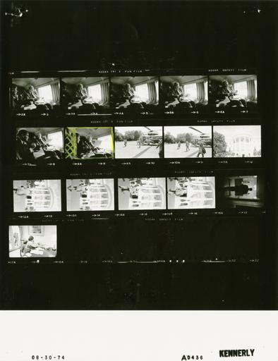 Keywords: Ford A0436 NLGRF photo contact sheet (1974-08-30)(Gerald Ford Library).jpg White House Photographic Office WHPO is housed at the Gerald R Ford Presidential Library a branch of the National Archives and Records Administration NARA <br/><br/> This file is a 200 dpi photo contact sheet having images from roll of film A0436 of the August 9 1974 - January 20 1977 Gerald R Ford White House Photographic Office Series A0001-A9999 and B0001-B2886 photographs <br/><br/> The date on the photo contact sheet is the date the roll of film was processed not necessarily the date the photographs were taken See table below for additional details 1974-08-30 Gerald R Ford Presidential Library Image http //www fordlibrarymuseum gov/library/whphotos/A0436_NLGRF jpg A0436_NLGRF jpg from http //www fordlibrarymuseum gov/library/whphotos/19740830whpo pdf White House Photographs August 30 1974 of the http //www fordlibrarymuseum gov/Library/whphotos/whpo asp White House Photographic Collection page White House Photographic Office WHPO <br/> Creator David Hume Kennerly PD-USGov Institution Institution Gerald R Ford Presidential Library Table wikitable sortable + Photo contact sheet A0436 U S President Ford Administration Gerald R Ford Library Frame s Tone Subject proper Subject generic Names Geographic Location Photographer Date - 3-7 BW Return from Andrews Air Force Base reading; pipe in mouth; glasses on top of head GRF Washington DC Marine One Kennerly 1974-08-30 - 8-9 BW Return from Andrews Air Force Base talking; glasses on top of head GRF Haig Washington DC Marine One Kennerly 1974-08-30 - 10-11 BW Return from Andrews Air Force Base waving walking from helicopter GRF Secret Service Marine One Crew South Lawn Kennerly 1974-08-30 - 12-16 BW Return from Andrews Air Force Base GRF walking; Mrs Ford and Howe waving from Balcony GRF Betty Ford Nancy Howe Others South Lawn towards Truman Balcony Kennerly 1974-08-30 - 17 BW walking into Cross Hall GRF Blue Room Kennerly 1974-08-30 - 18 BW Staff Assistant on telephone Nell Yates Secretary's Office Kennerly 1974-08-30 Gerald R Ford Presidential Library and Museum-cooperation PD-USGov Contact sheets by the Ford White House August 1974 Photographs by David Hume Kennerly from 1974 |