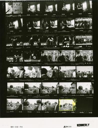 Keywords: Ford A0439 NLGRF photo contact sheet (1974-08-30)(Gerald Ford Library).jpg White House Photographic Office WHPO is housed at the Gerald R Ford Presidential Library a branch of the National Archives and Records Administration NARA <br/><br/> This file is a 200 dpi photo contact sheet having images from roll of film A0439 of the August 9 1974 - January 20 1977 Gerald R Ford White House Photographic Office Series A0001-A9999 and B0001-B2886 photographs <br/><br/> The date on the photo contact sheet is the date the roll of film was processed not necessarily the date the photographs were taken See table below for additional details 1974-08-30 Gerald R Ford Presidential Library Image http //www fordlibrarymuseum gov/library/whphotos/A0439_NLGRF jpg A0439_NLGRF jpg from http //www fordlibrarymuseum gov/library/whphotos/19740830whpo pdf White House Photographs August 30 1974 of the http //www fordlibrarymuseum gov/Library/whphotos/whpo asp White House Photographic Collection page White House Photographic Office WHPO <br/> Creator David Hume Kennerly PD-USGov Institution Institution Gerald R Ford Presidential Library Table wikitable sortable + Photo contact sheet A0439 U S President Ford Administration Gerald R Ford Library Frame s Tone Subject proper Subject generic Names Geographic Location Photographer Date - 1A BW Trip to Andrews Air Force Base approaching helicopter GRF Secret Service military personnel South Lawn Kennerly 1974-08-30 - 2A-4A BW Flight to Andrews Air Force Base Maryland reading; smoking pipe; glasses on top of head GRF Washington DC Marine One Kennerly 1974-08-30 - 5A-6A BW Flight to Andrews Air Force Base Maryland looking out window; glasses on top of head GRF Washington DC Marine One Kennerly 1974-08-30 - 7A BW Flight to Andrews Air Force Base Maryland talking GRF Haig Washington DC Marine One Kennerly 1974-08-30 - 8A BW Flight to Andrews Air Force Base Maryland talking GRF Hartmann Haig Washington DC Marine One Kennerly 1974-08-30 - 9A BW Flight to Andrews Air Force Base Maryland talking GRF Haig Washington DC Marine One Kennerly 1974-08-30 - 10A BW Ohio State University Commencement - Columbus Ohio standing heads bowed GRF Harold Enarson Albert J Kuhn Platform Guests Columbus OH St John Arena Kennerly 1974-08-30 - 11A-12A BW Ohio State University Commencement - Columbus Ohio receiving honorary doctorate cowl GRF Edward Moultron Columbus OH St John Arena Kennerly 1974-08-30 - 13A-14A BW Ohio State University Commencement - Columbus Ohio receiving honorary degree GRF John H Dunlop Platform guests Columbus OH St John Arena Kennerly 1974-08-30 - 15A BW Ohio State University Commencement - Columbus Ohio seated applauding GRF Harold Enarson Platform guests Columbus OH St John Arena Kennerly 1974-08-30 - 16A BW Ohio State University Commencement - Columbus Ohio approaching podium GRF Albert J Kuhn Platform guests Columbus OH St John Arena Kennerly 1974-08-30 - 17A BW Ohio State University Commencement - Columbus Ohio smiling from podium; academic robe and mortarboard GRF Columbus OH St John Arena Kennerly 1974-08-30 - 18A-20A BW Trip to Ohio State University - Columbus Ohio standing talking GRF Ohio Republican leaders Columbus OH Port Columbus Airport - General Aviation Facility Kennerly 1974-08-30 - 21A-24A BW Trip to Ohio State University - Columbus Ohio walking towards crowd GRF Ohio Republican leaders Columbus OH Port Columbus Airport Kennerly 1974-08-30 - 25A BW Trip to Ohio State University - Columbus Ohio waving GRF Secret Service Crowd Columbus OH Port Columbus Airport Kennerly 1974-08-30 - 26A-34A BW Trip to Ohio State University - Columbus Ohio handshaking GRF Secret Service Crowd Columbus OH Port Columbus Airport Kennerly 1974-08-30 Gerald R Ford Presidential Library and Museum-cooperation PD-USGov Contact sheets by the Ford White House August 1974 Photographs by David Hume Kennerly from 1974 |