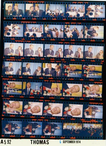 Keywords: Ford A0592 NLGRF photo contact sheet (1974-09-06)(Gerald Ford Library).jpg White House Photographic Office WHPO is housed at the Gerald R Ford Presidential Library a branch of the National Archives and Records Administration NARA <br/><br/> This file is a 200 dpi photo contact sheet having images from roll of film A0592 of the August 9 1974 - January 20 1977 Gerald R Ford White House Photographic Office Series A0001-A9999 and B0001-B2886 photographs <br/><br/> The date on the photo contact sheet is the date the roll of film was processed not necessarily the date the photographs were taken See table below for additional details 1974-09-06 Gerald R Ford Presidential Library Image http //www fordlibrarymuseum gov/library/whphotos/A0592_NLGRF jpg A0592_NLGRF jpg from http //www fordlibrarymuseum gov/library/whphotos/19740906whpo pdf White House Photographs September 6 1974 of the http //www fordlibrarymuseum gov/Library/whphotos/whpo asp White House Photographic Collection page White House Photographic Office WHPO - Thomas PD-USGov Institution Institution Gerald R Ford Presidential Library Table wikitable sortable + Photo contact sheet A0592 U S President Ford Administration Gerald R Ford Library Frame s Tone Subject proper Subject generic Names Geographic Location Photographer Date - 36A-37A Color Bicentennial of First Continental Congress - Philadelphia Pennsylvania standing at podium making remarks - ex long shot GRF dinner panelists Philadelphia PA Independence Mall -tent Thomas 1974-09-06 - 26A-27A Color Bicentennial of First Continental Congress - Philadelphia Pennsylvania close-up; smoking pipe GRF Philadelphia PA Independence Mall -tent Thomas 1974-09-06 - 3A-4A Color Bicentennial of First Continental Congress - Philadelphia Pennsylvania seated on platform talking GRF Rep Rhodes Philadelphia PA Independence Mall -tent Thomas 1974-09-06 - 5A Color Bicentennial of First Continental Congress - Philadelphia Pennsylvania seated on platform talking; military in foreground Armstrong Rep Rhodes GRF Gov Shapp PA military Secret Service Philadelphia PA Independence Mall -tent Thomas 1974-09-06 - 6A Color Bicentennial of First Continental Congress - Philadelphia Pennsylvania seated on platform talking Rep Rhodes GRF Gov Shapp PA Philadelphia PA Independence Mall -tent Thomas 1974-09-06 - 7A-8A Color Bicentennial of First Continental Congress - Philadelphia Pennsylvania seated on platform being served Rep Rhodes GRF Gov Shapp PA two waiters Philadelphia PA Independence Mall -tent Thomas 1974-09-06 - 9A Color Bicentennial of First Continental Congress - Philadelphia Pennsylvania seated on platform being served Rep Rhodes GRF Gov Shapp PA one waiter Philadelphia PA Independence Mall -tent Thomas 1974-09-06 - 10A-11A Color Bicentennial of First Continental Congress - Philadelphia Pennsylvania seated on platform crowd blocking GRF Rep Rhodes GRF Gov Shapp PA one waiter Crowd Philadelphia PA Independence Mall -tent Thomas 1974-09-06 - 12A-20A Color Bicentennial of First Continental Congress - Philadelphia Pennsylvania seated on platform talking; GRF smoking pipe GRF Gov Shapp PA Philadelphia PA Independence Mall -tent Thomas 1974-09-06 - 25A Color Bicentennial of First Continental Congress - Philadelphia Pennsylvania GRF wearing glasses smoking pipe GRF Gov Shapp PA Philadelphia PA Independence Mall -tent Thomas 1974-09-06 - 21A-23A Color Bicentennial of First Continental Congress - Philadelphia Pennsylvania seated on platform; lighting smoking pipe GRF Philadelphia PA Independence Mall -tent Thomas 1974-09-06 - 24A Color Bicentennial of First Continental Congress - Philadelphia Pennsylvania laughing smoking pipe GRF Philadelphia PA Independence Mall -tent Thomas 1974-09-06 - 28A Color Bicentennial of First Continental Congress - Philadelphia Pennsylvania close-up; smoking pipe GRF Philadelphia PA Independence Mall -tent Thomas 1974-09-06 - 29A-31A Color Bicentennial of First Continental Congress - Philadelphia Pennsylvania smiling portrait s GRF Philadelphia PA Independence Mall -tent Thomas 1974-09-06 - 32A-35A Color Bicentennial of First Continental Congress - Philadelphia Pennsylvania standing at podium making remarks - long shot GRF dinner panelists Philadelphia PA Independence Mall -tent Thomas 1974-09-06 Gerald R Ford Presidential Library and Museum-cooperation PD-USGov Contact sheets by the Ford White House September 1974 |