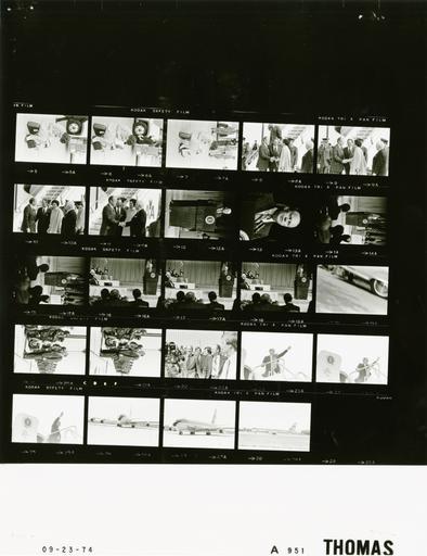 Keywords: Ford A0951 NLGRF photo contact sheet (1974-09-23)(Gerald Ford Library).jpg White House Photographic Office WHPO is housed at the Gerald R Ford Presidential Library a branch of the National Archives and Records Administration NARA <br/><br/> This file is a 200 dpi photo contact sheet having images from roll of film A0951 of the August 9 1974 - January 20 1977 Gerald R Ford White House Photographic Office Series A0001-A9999 and B0001-B2886 photographs <br/><br/> The date on the photo contact sheet is the date the roll of film was processed not necessarily the date the photographs were taken See table below for additional details 1974-09-23 Gerald R Ford Presidential Library Image http //www fordlibrarymuseum gov/library/whphotos/A0951_NLGRF jpg A0951_NLGRF jpg from http //www fordlibrarymuseum gov/library/whphotos/19740923whpo pdf White House Photographs September 23 1974 of the http //www fordlibrarymuseum gov/Library/whphotos/whpo asp White House Photographic Collection page White House Photographic Office WHPO - Thomas PD-USGov Institution Institution Gerald R Ford Presidential Library Table wikitable sortable + Photo contact sheet A0951 U S President Ford Administration Gerald R Ford Library Frame s Tone Subject proper Subject generic Names Geographic Location Photographer Date - 5-7 BW Arrival in Detroit for Ninth World Energy Conference - Romulus Michigan seated on suitcase reading; bus in background Unidentified Woman Romulus MI Metropolitan Airport - American Airlines Hangar Thomas 1974-09-23 - 8-11 BW Arrival in Detroit for Ninth World Energy Conference - Romulus Michigan greeting handshaking at base of stairs; Air Force One in background GRF Gov Mrs William G Milliken Walker Cisler Romulus MI Metropolitan Airport - American Airlines Hangar Thomas 1974-09-23 - 12-18 BW Address before the Ninth World Energy Conference - Detroit Michigan speaking at podium - taken from various distances GRF Others Detroit MI Cobo Arena Thomas 1974-09-23 - 19 BW Thomas 1974-09-23 - 20-21 BW Departure following Ninth World Energy Conference - Romulus Michigan greeting handshaking GRF police officers Romulus MI Metropolitan Airport - American Airlines Hangar Thomas 1974-09-23 - 22 BW Departure following Ninth World Energy Conference - Romulus Michigan walking talking GRF Keiser Secret Service Media Romulus MI Metropolitan Airport - American Airlines Hangar Thomas 1974-09-23 - 23-25 BW Departure following Ninth World Energy Conference - Romulus Michigan waving from doorway of Air Force One GRF Romulus MI Metropolitan Airport - American Airlines Hangar Thomas 1974-09-23 - 26-28 BW Departure following Ninth World Energy Conference - Romulus Michigan Air Force One taxiing; moving away from camera Romulus MI Metropolitan Airport Thomas 1974-09-23 Gerald R Ford Presidential Library and Museum-cooperation PD-USGov Contact sheets by the Ford White House September 1974 |