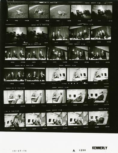 | Keywords: Ford A1258 NLGRF photo contact sheet (1974-10-07)(Gerald Ford Library).jpg White House Photographic Office WHPO is housed at the Gerald R Ford Presidential Library a branch of the National Archives and Records Administration NARA <br/><br/> This file is a 200 dpi photo contact sheet having images from roll of film A1258 of the August 9 1974 - January 20 1977 Gerald R Ford White House Photographic Office Series A0001-A9999 and B0001-B2886 photographs <br/><br/> The date on the photo contact sheet is the date the roll of film was processed not necessarily the date the photographs were taken See table below for additional details 1974-10-07 Gerald R Ford Presidential Library Image http //www fordlibrarymuseum gov/library/whphotos/A1258_NLGRF jpg A1258_NLGRF jpg from http //www fordlibrarymuseum gov/library/whphotos/19741007whpo pdf White House Photographs October 7 1974 of the http //www fordlibrarymuseum gov/Library/whphotos/whpo asp White House Photographic Collection page White House Photographic Office WHPO <br/> Creator David Hume Kennerly PD-USGov Institution Institution Gerald R Ford Presidential Library Table wikitable sortable + Photo contact sheet A1258 U S President Ford Administration Gerald R Ford Library Frame s Tone Subject proper Subject generic Names Geographic Location Photographer Date - 10 BW Arrival for Dinner Honoring United States Senator George Aiken of Vermont - Burlington Vermont standing posing on platform; GRF's eyes closed GRF Sen Aiken Burlington VT University of Vermont - Patrick Gymnasium Kennerly 1974-10-07 - 11-19 BW Dinner Honoring United States Senator George Aiken of Vermont - Burlington Vermont standing guests applauding GRF Sen Aiken Platform Guests Burlington VT University of Vermont -Patrick Gymnasium Kennerly 1974-10-07 - 20-22 BW Return Flight from Dinner Honoring United States Sen George Aiken of Vermont seated talking Rumsfeld Air Force One - President's Cabin Kennerly 1974-10-07 - 23-25 BW Return Flight from Dinner Honoring United States Sen George Aiken of Vermont seated talking; GRF back to camera smoking pipe in 23 GRF Rumsfeld Air Force One - President's Cabin Kennerly 1974-10-07 - 26-32 BW Return Flight from Dinner Honoring United States Sen George Aiken of Vermont seated; smoking pipe talking on telephone; various angles and distances GRF Air Force One - President's Cabin Kennerly 1974-10-07 - 3-5 BW Pet Golden Retriever Susan lying on grass playing with dog Susan Ford Liberty South Lawn Kennerly 1974-10-07 - 6-9 BW Prior to Dinner Honoring United States Senator George Aiken of Vermont - Burlington Vermont seated talking; various angles and distances GRF Rumsfeld Burlington VT Ramada Inn President's Suite Kennerly 1974-10-07 Gerald R Ford Presidential Library and Museum-cooperation PD-USGov Contact sheets by the Ford White House October 1974 Photographs by David Hume Kennerly from 1974 |