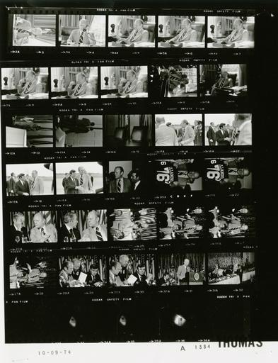 Keywords: Ford A1334 NLGRF photo contact sheet (1974-10-09)(Gerald Ford Library).jpg White House Photographic Office WHPO is housed at the Gerald R Ford Presidential Library a branch of the National Archives and Records Administration NARA <br/><br/> This file is a 200 dpi photo contact sheet having images from roll of film A1334 of the August 9 1974 - January 20 1977 Gerald R Ford White House Photographic Office Series A0001-A9999 and B0001-B2886 photographs <br/><br/> The date on the photo contact sheet is the date the roll of film was processed not necessarily the date the photographs were taken See table below for additional details 1974-10-09 Gerald R Ford Presidential Library Image http //www fordlibrarymuseum gov/library/whphotos/A1334_NLGRF jpg A1334_NLGRF jpg from http //www fordlibrarymuseum gov/library/whphotos/19741009whpo pdf White House Photographs October 9 1974 of the http //www fordlibrarymuseum gov/Library/whphotos/whpo asp White House Photographic Collection page White House Photographic Office WHPO - Thomas PD-USGov Institution Institution Gerald R Ford Presidential Library Table wikitable sortable + Photo contact sheet A1334 U S President Ford Administration Gerald R Ford Library Frame s Tone Subject proper Subject generic Names Geographic Location Photographer Date - 23-24 BW Third Annual Distinguished Republican Award Dinner -Philadelphia Pennsylvania seated at table talking GRF William Scranton Philadelphia PA Philadelphia Sheraton Hotel - Delaware Valley Suite A Thomas 1974-10-09 - 25-28 BW Third Annual Distinguished Republican Award Dinner -Philadelphia Pennsylvania GRF and Scranton standing others seated in foreground GRF William Scranton Secret Service Others Philadelphia PA Philadelphia Sheraton Hotel - Delaware Valley Suite A Thomas 1974-10-09 - 29-30 BW Third Annual Distinguished Republican Award Dinner -Philadelphia Pennsylvania GRF and Lewis seated; man leaning in between them talking GRF Drew Lewis Unidentified Man Philadelphia PA Philadelphia Sheraton Hotel - Delaware Valley Suite A Thomas 1974-10-09 - 31 BW Third Annual Distinguished Republican Award Dinner -Philadelphia Pennsylvania GRF speaking at podium Lewis seated nearby GRF Drew Lewis Philadelphia PA Philadelphia Sheraton Hotel - Delaware Valley Suite A Thomas 1974-10-09 - 32 BW Third Annual Distinguished Republican Award Dinner -Philadelphia Pennsylvania GRF speaking at podium others seated on either side GRF Drew Lewis Others Philadelphia PA Philadelphia Sheraton Hotel - Delaware Valley Suite A Thomas 1974-10-09 - 3-4 BW seated at desk talking on telephone GRF Oval Office Thomas 1974-10-09 - 5-12 BW seated at desk reading documents smoking pipe GRF Oval Office Thomas 1974-10-09 - 13-14 BW walking out door to Scheduling and Advance Office GRF O'Donnell Oval Office Thomas 1974-10-09 - 16-19 BW Arrival in Philadelphia Pennsylvania for Republican Party Speeches greeting handshaking; all not in every frame GRF Drew Lewis Others Philadelphia PA Philadelphia International Airport - Tarmac Thomas 1974-10-09 - 20 BW Trip to Philadelphia Pennsylvania for Republican Party Speeches standing talking GRF Drew Lewis Philadelphia PA Philadelphia International Airport Thomas 1974-10-09 - 21-22 BW Trip to Philadelphia Pennsylvania for Republican Party Speeches holding Villanova 76 football jersey GRF Philadelphia PA Philadelphia Sheraton Hotel Thomas 1974-10-09 - 15 BW two chairs Cabinet Room Thomas 1974-10-09 Gerald R Ford Presidential Library and Museum-cooperation PD-USGov Contact sheets by the Ford White House October 1974 |
