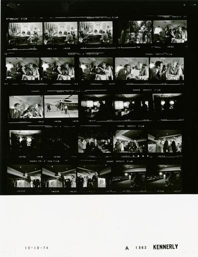 Keywords: Ford A1362 NLGRF photo contact sheet (1974-10-10)(Gerald Ford Library).jpg White House Photographic Office WHPO is housed at the Gerald R Ford Presidential Library a branch of the National Archives and Records Administration NARA <br/><br/> This file is a 200 dpi photo contact sheet having images from roll of film A1362 of the August 9 1974 - January 20 1977 Gerald R Ford White House Photographic Office Series A0001-A9999 and B0001-B2886 photographs <br/><br/> The date on the photo contact sheet is the date the roll of film was processed not necessarily the date the photographs were taken See table below for additional details 1974-10-10 Gerald R Ford Presidential Library Image http //www fordlibrarymuseum gov/library/whphotos/A1362_NLGRF jpg A1362_NLGRF jpg from http //www fordlibrarymuseum gov/library/whphotos/19741010whpo pdf White House Photographs October 10 1974 of the http //www fordlibrarymuseum gov/Library/whphotos/whpo asp White House Photographic Collection page White House Photographic Office WHPO <br/> Creator David Hume Kennerly PD-USGov Institution Institution Gerald R Ford Presidential Library Table wikitable sortable + Photo contact sheet A1362 U S President Ford Administration Gerald R Ford Library Frame s Tone Subject proper Subject generic Names Geographic Location Photographer Date - 2A-4A BW seated around desk GRF Ash Cole Areeda Timmons Scowcroft Others Oval Office Kennerly 1974-10-10 - 5A BW talking walking under trees towards helicopter GRF Burch South Lawn Kennerly 1974-10-10 - 6A-7A BW Helicopter Flight to Andrews Air Force Base GRF talking to Rumsfeld off camera others seated in background copter GRF Seidman Nessen Lukash Marine One Kennerly 1974-10-10 - 8A-9A BW Helicopter Flight to Andrews Air Force Base GRF talking to Rumsfeld others seated in background GRF Rumsfeld Seidman Nessen Lukash Marine One Kennerly 1974-10-10 - 10A-12A BW Helicopter Flight to Andrews Air Force Base seated talking GRF Rumsfeld Marine One Kennerly 1974-10-10 - 13A BW Following helicopter Flight to Andrews Air Force Base Maryland walking; GRF handshaking with Air Force officer -Marine One in background GRF Rumsfeld Keiser Air Force Personnel Andrews Air Force Base MD Andrews Air Force Base Kennerly 1974-10-10 - 14A-17A BW Prior to Michigan State Republican Patrons' Reception - Detroit Michigan standing talking GRF Rumsfeld Others Detroit MI Pontchartrain Hotel - President's Suite Kennerly 1974-10-10 - 18A-21A BW Michigan State Republican Patrons' Reception - Detroit Michigan GRF entering room walking towards podium GRF Others Detroit MI Pontchartrain Hotel - Versailles Ballroom Kennerly 1974-10-10 - 22A-24A BW Michigan State Republican Patrons' Reception - Detroit Michigan GRF speaking from podium others standing applauding GRF Others Detroit MI Pontchartrain Hotel - Versailles Ballroom Kennerly 1974-10-10 - 25A-26A BW Michigan State Republican Patrons' Reception - Detroit Michigan GRF speaking from podium audience seated - taken from behind GRF GRF Audience Detroit MI Pontchartrain Hotel - Versailles Ballroom Kennerly 1974-10-10 Gerald R Ford Presidential Library and Museum-cooperation PD-USGov Contact sheets by the Ford White House October 1974 Photographs by David Hume Kennerly from 1974 |