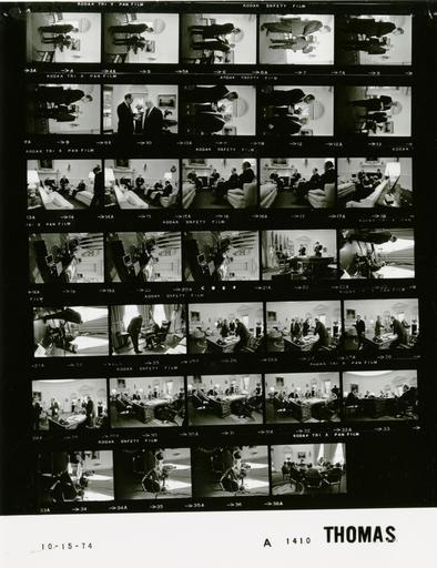 | Keywords: Ford A1410 NLGRF photo contact sheet (1974-10-15)(Gerald Ford Library).jpg White House Photographic Office WHPO is housed at the Gerald R Ford Presidential Library a branch of the National Archives and Records Administration NARA <br/><br/> This file is a 200 dpi photo contact sheet having images from roll of film A1410 of the August 9 1974 - January 20 1977 Gerald R Ford White House Photographic Office Series A0001-A9999 and B0001-B2886 photographs <br/><br/> The date on the photo contact sheet is the date the roll of film was processed not necessarily the date the photographs were taken See table below for additional details 1974-10-15 Gerald R Ford Presidential Library Image http //www fordlibrarymuseum gov/library/whphotos/A1410_NLGRF jpg A1410_NLGRF jpg from http //www fordlibrarymuseum gov/library/whphotos/19741015whpo pdf White House Photographs October 15 1974 of the http //www fordlibrarymuseum gov/Library/whphotos/whpo asp White House Photographic Collection page White House Photographic Office WHPO - Thomas PD-USGov Institution Institution Gerald R Ford Presidential Library Table wikitable sortable + Photo contact sheet A1410 U S President Ford Administration Gerald R Ford Library Frame s Tone Subject proper Subject generic Names Geographic Location Photographer Date - 22 BW Black Star Photographer GRF seated at desk O'Donnell standing nearby; ward shooting photos GRF O'Donnell Fred Ward Oval Office Thomas 1974-10-15 - 23-25 BW GRF seated working at credenza behind desk O'Donnell leaning over GRF O'Donnell Oval Office Thomas 1974-10-15 - 26-29 BW greeting handshaking -all not in every frame GRF Cole Ash Greenspan Lynn James Mitchell Oval Office Thomas 1974-10-15 - 30-33 BW seated around desk GRF Cole Ash Greenspan Lynn James Mitchell Oval Office Thomas 1974-10-15 - 34-37 BW seated around desk; Mitchell standing beside GRF pointing at documents GRF Cole Ash Greenspan Lynn James Mitchell Oval Office Thomas 1974-10-15 - 4-12 BW Ambassador of Canada to the United States standing talking GRF Amb Marcel Cadieux Oval Office Thomas 1974-10-15 - 13 BW Ambassador of Canada to the United States walking towards fireplace GRF Amb Marcel Cadieux Oval Office Thomas 1974-10-15 - 14-18 BW Ambassador of Canada to the United States seated near fireplace various angles and distances GRF Amb Marcel Cadieux Scowcroft Others Oval Office Thomas 1974-10-15 - 19-21 BW seated at desk talking on telephone reading documens GRF Oval Office Thomas 1974-10-15 Gerald R Ford Presidential Library and Museum-cooperation PD-USGov Contact sheets by the Ford White House October 1974 |