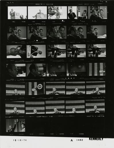 | Keywords: Ford A1452 NLGRF photo contact sheet (1974-10-16)(Gerald Ford Library).jpg White House Photographic Office WHPO is housed at the Gerald R Ford Presidential Library a branch of the National Archives and Records Administration NARA <br/><br/> This file is a 200 dpi photo contact sheet having images from roll of film A1452 of the August 9 1974 - January 20 1977 Gerald R Ford White House Photographic Office Series A0001-A9999 and B0001-B2886 photographs <br/><br/> The date on the photo contact sheet is the date the roll of film was processed not necessarily the date the photographs were taken See table below for additional details 1974-10-16 Gerald R Ford Presidential Library Image http //www fordlibrarymuseum gov/library/whphotos/A1452_NLGRF jpg A1452_NLGRF jpg from http //www fordlibrarymuseum gov/library/whphotos/19741016whpo pdf White House Photographs October 16 1974 of the http //www fordlibrarymuseum gov/Library/whphotos/whpo asp White House Photographic Collection page White House Photographic Office WHPO <br/> Creator David Hume Kennerly PD-USGov Institution Institution Gerald R Ford Presidential Library Table wikitable sortable + Photo contact sheet A1452 U S President Ford Administration Gerald R Ford Library Frame s Tone Subject proper Subject generic Names Geographic Location Photographer Date - 3 BW United States Representative from Nebraska NE ; Campaign Rally Nebraska State Republican Central Committee - Lincoln Nebraska Thone at podium; GRF seated nearby GRF Rep Thone Lincoln NE Lincoln Municipal Airport - Tarmac Kennerly 1974-10-16 - 4 BW Campaign Rally Nebraska State Republican Central Committee - Lincoln Nebraska Speaking at podium GRF Lincoln NE Lincoln Municipal Airport - Tarmac Kennerly 1974-10-16 - 5 BW Campaign Rally Nebraska State Republican Central Committee - Lincoln Nebraska GRF speaking at podium; others seated listening - taken from left of GRF GRF Platform Guests Crowd Lincoln NE Lincoln Municipal Airport - Tarmac Kennerly 1974-10-16 - 6 BW Campaign Trip to Indiana - Indianapolis Indiana seated Cheney on telephone GRF Cheney Indianapolis IN Indiana Convention-Exposition Center -VIP Suite Kennerly 1974-10-16 - 7-12 BW Campaign Trip to Indiana - Indianapolis Indiana seated GRF on telephone; Cheney in background out of focus GRF Cheney Indianapolis IN Indiana Convention-Exposition Center -VIP Suite Kennerly 1974-10-16 - 13-17 BW Campaign Trip to Indiana - Indianapolis Indiana on telephone; smoking holding pipe - close up GRF Indianapolis IN Indiana Convention-Exposition Center -VIP Suite Kennerly 1974-10-16 - 18-19 BW Campaign Trip to Indiana - Indianapolis Indiana smoking pipe; close-up profile portrait s GRF Indianapolis IN Indiana Convention-Exposition Center -VIP Suite Kennerly 1974-10-16 - 20-21 BW Address at Republican Fundraising Dinner - Indianapolis Indiana GRF speaking from podium - long shot taken from right GRF Platform Guests Indianapolis IN Indiana Convention-Exposition Center -Auditorium Kennerly 1974-10-16 - 22-32 BW Address at Republican Fundraising Dinner - Indianapolis Indiana speaking from podium - various angles and distances GRF large flag in background Indianapolis IN Indiana Convention-Exposition Center -Auditorium Kennerly 1974-10-16 - 33 BW Address at Republican Fundraising Dinner - Indianapolis Indiana GRF waving from podium agent nearby GRF Secret Service Agent Indianapolis IN Indiana Convention-Exposition Center -Auditorium Kennerly 1974-10-16 Gerald R Ford Presidential Library and Museum-cooperation PD-USGov Contact sheets by the Ford White House October 1974 Photographs by David Hume Kennerly from 1974 |