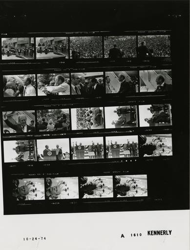 Keywords: Ford A1610 NLGRF photo contact sheet (1974-10-24)(Gerald Ford Library).jpg White House Photographic Office WHPO is housed at the Gerald R Ford Presidential Library a branch of the National Archives and Records Administration NARA <br/><br/> This file is a 200 dpi photo contact sheet having images from roll of film A1610 of the August 9 1974 - January 20 1977 Gerald R Ford White House Photographic Office Series A0001-A9999 and B0001-B2886 photographs <br/><br/> The date on the photo contact sheet is the date the roll of film was processed not necessarily the date the photographs were taken See table below for additional details 1974-10-24 Gerald R Ford Presidential Library Image http //www fordlibrarymuseum gov/library/whphotos/A1610_NLGRF jpg A1610_NLGRF jpg from http //www fordlibrarymuseum gov/library/whphotos/19741024whpo pdf White House Photographs October 24 1974 of the http //www fordlibrarymuseum gov/Library/whphotos/whpo asp White House Photographic Collection page White House Photographic Office WHPO <br/> Creator David Hume Kennerly PD-USGov Institution Institution Gerald R Ford Presidential Library Table wikitable sortable + Photo contact sheet A1610 U S President Ford Administration Gerald R Ford Library Frame s Tone Subject proper Subject generic Names Geographic Location Photographer Date - 2A-3A BW Motorcade from Des Moines Municipal Airport to Iowa State Capitol; Governor of Iowa - Des Moines Iowa GRF and Ray standing in limousine waving - backs to camera GRF Gov Ray Secret Service Crowd Des Moines IA Downtown Street Kennerly 1974-10-24 - 4A-6A BW Republican Campaign Rally at Iowa State Capitol -Des Moines Iowa GRF at podium speaking; crowd in background GRF Crowd Des Moines IA Capitol Grounds Kennerly 1974-10-24 - 7A-8A BW Following Republican Campaign Rally at Iowa State Capitol - Des Moines Iowa greeting handshaking mingling GRF Crowd Des Moines IA Capitol Grounds Kennerly 1974-10-24 - 9A BW Prior to Departure From Campaign Trip to Iowa -Des Moines Iowa standing near Air Force One steps; hair blowing in wind GRF Burch Rumsfeld Des Moines IA Des Moines Municipal Airport Kennerly 1974-10-24 - 10-12A BW Arrival in Illinois -Chicago Illinois greeting handshaking waving - all not in every frame GRF Others Chicago IL O'Hare International Airport Kennerly 1974-10-24 - 13A BW Honor Les Arends Day ; United States Representative from Illinois IL - Melvin Illinois Arends standing at podium others seated - taken from behind platform towards crowd GRF Rep Mrs Arends Platform Guests Crowd Melvin IL Ford County Fairgrounds Kennerly 1974-10-24 - 14A BW Honor Les Arends Day ; United States Representative from Illinois IL - Melvin Illinois GRF standing at podium others seated - taken from behind crowd towards platform GRF Rep Mrs Arends Platform Guests Crowd Melvin IL Ford County Fairgrounds Kennerly 1974-10-24 - 15A-18A BW Honor Les Arends Day ; United States Representative from Illinois IL - Melvin Illinois GRF presenting commemorative plaque to Arends GRF Rep Arends Platform Guests Melvin IL Ford County Fairgrounds Kennerly 1974-10-24 - 19A-20A BW Honor Les Arends Day ; United States Representative from Illinois IL - Melvin Illinois Minister at podium offering Benediction; others standing heads bowed GRF Rep Arends Platform Guests Minister Melvin IL Ford County Fairgrounds Kennerly 1974-10-24 - 21A-25A BW Dinner Hosted by United Republican Fund of Illinois - Chicago Illinois speaking at podium - close up; chandelier in background gives GRF antler look GRF Chicago IL Conrad Hilton Hotel - International Ballroom Kennerly 1974-10-24 Gerald R Ford Presidential Library and Museum-cooperation PD-USGov Contact sheets by the Ford White House October 1974 Photographs by David Hume Kennerly from 1974 |