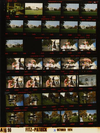 Keywords: Ford A1690 NLGRF photo contact sheet (1974-10-31)(Gerald Ford Library).jpg White House Photographic Office WHPO is housed at the Gerald R Ford Presidential Library a branch of the National Archives and Records Administration NARA <br/><br/> This file is a 200 dpi photo contact sheet having images from roll of film A1690 of the August 9 1974 - January 20 1977 Gerald R Ford White House Photographic Office Series A0001-A9999 and B0001-B2886 photographs <br/><br/> The date on the photo contact sheet is the date the roll of film was processed not necessarily the date the photographs were taken See table below for additional details 1974-10-31 Gerald R Ford Presidential Library Image http //www fordlibrarymuseum gov/library/whphotos/A1690_NLGRF jpg A1690_NLGRF jpg from http //www fordlibrarymuseum gov/library/whphotos/19741031whpo pdf White House Photographs October 31 1974 of the http //www fordlibrarymuseum gov/Library/whphotos/whpo asp White House Photographic Collection page White House Photographic Office WHPO - Fitz-Patrick PD-USGov Institution Institution Gerald R Ford Presidential Library Table wikitable sortable + Photo contact sheet A1690 U S President Ford Administration Gerald R Ford Library Frame s Tone Subject proper Subject generic Names Geographic Location Photographer Date - 2A Color seated typing Unidentified Woman East Wing Office Fitz-Patrick 1974-10-31 - 3A Color helicopter sitting on lawn; White House in background Marine One South Lawn Fitz-Patrick 1974-10-31 - 4A-12A Color Flight to Andrews Air Force Base helicopter taking off of lawn; White House in background Marine One South Lawn Fitz-Patrick 1974-10-31 - 13A Color Fitz-Patrick 1974-10-31 - 14A-25A Color Trick or Treat for UNICEF Children standing Mrs Ford walking putting treats in bags Betty Ford Children in Costumes South Driveway Fitz-Patrick 1974-10-31 - 26A Color Second Floor - West Sitting Hall Window from Outside Outside West Wing of White House Fitz-Patrick 1974-10-31 - 27A-33A Color Prior to Making public service film The Time of Your Life supporting the Presidential Sports Award Program standing setting up for taped message; White House in background GRF Sound Film Technicians South Lawn Fitz-Patrick 1974-10-31 - 34A-36A Color Making Public Service Film The Time of Your Life supporting the Presidential Sports Award Program standing setting up for taped message; White House in background GRF Sound Film Technicians South Lawn Fitz-Patrick 1974-10-31 Gerald R Ford Presidential Library and Museum-cooperation PD-USGov Contact sheets by the Ford White House October 1974 |