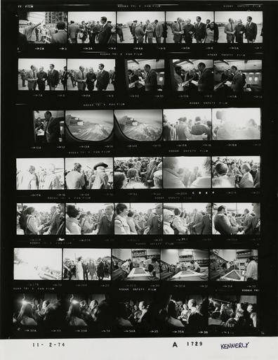 Keywords: Ford A1729 NLGRF photo contact sheet (1974-11-01)(Gerald Ford Library).jpg White House Photographic Office WHPO is housed at the Gerald R Ford Presidential Library a branch of the National Archives and Records Administration NARA <br/><br/> This file is a 200 dpi photo contact sheet having images from roll of film A1729 of the August 9 1974 - January 20 1977 Gerald R Ford White House Photographic Office Series A0001-A9999 and B0001-B2886 photographs <br/><br/> The date on the photo contact sheet is the date the roll of film was processed not necessarily the date the photographs were taken See table below for additional details 1974-11-01 Gerald R Ford Presidential Library Image http //www fordlibrarymuseum gov/library/whphotos/A1729_NLGRF jpg A1729_NLGRF jpg from http //www fordlibrarymuseum gov/library/whphotos/19741101whpo pdf White House Photographs November 1 1974 of the http //www fordlibrarymuseum gov/Library/whphotos/whpo asp White House Photographic Collection page White House Photographic Office WHPO <br/> Creator David Hume Kennerly PD-USGov Institution Institution Gerald R Ford Presidential Library Table wikitable sortable + Photo contact sheet A1729 U S President Ford Administration Gerald R Ford Library Frame s Tone Subject proper Subject generic Names Geographic Location Photographer Date - 2A BW Prior to Departure for Long Beach California - Los Angeles California GRF waving GRF Crowd Los Angeles CA Century Plaza Hotel - Outside Kennerly 1974-11-01 - 3A-8A BW Prior to Departure for Salt Lake City Utah - Portland Oregon standing talking GRF Others Portland OR Portland International Airport Kennerly 1974-11-02 - 9A-12A BW Impromptu Interview During Flight to Salt Lake City Utah standing talking GRF Media Air Force One Kennerly 1974-11-02 - 13A-14A BW Flight to Salt Lake City Utah - Redding California view out window; wing and two engines visible Mt Shasta Over Redding CA Air Force One Kennerly 1974-11-02 - 15A-18A BW Arrival for Campaign Trip to Utah; Mayor of Salt Lake City; Republican Senate Candidate from Utah; Sons of GRF - Salt Lake City Utah greeting handshaking; all not in every frame GRF Jack Ford Steve Ford Mayor Garn Others Salt Lake City UT Utah International Airport Kennerly 1974-11-02 - 19A-26A BW Arrival for Campaign Trip to Utah; Mayor of Salt Lake City; Republican Senate Candidate from Utah -Salt Lake City Utah greeting handshaking; all not in every frame GRF Mayor Garn Crowd Salt Lake City UT Utah International Airport Kennerly 1974-11-02 - 27A BW Kennerly 1974-11-02 - 28A BW Prior to Tour of Community Center; Mayor of Salt Lake City; Republican Senate Candidate from Utah -Salt Lake City Utah walking towards Center GRF Mayor Garn Media Others Salt Lake City UT Columbus Community Center -Outside Kennerly 1974-11-02 - 29A-31A BW Tour of Community Center -Salt Lake City Utah GRF watching students learning work skills GRF Students Others Salt Lake City UT Columbus Community Center -Workshop Room Kennerly 1974-11-02 - 32A-36A BW Impromptu Conference Following Campaign Rally for Mayor Garn - Salt Lake City Utah mingling talking GRF Students Salt Lake City UT University of Utah Special Events Center Kennerly 1974-11-02 Gerald R Ford Presidential Library and Museum-cooperation PD-USGov Contact sheets by the Ford White House November 1974 Photographs by David Hume Kennerly from 1974 |