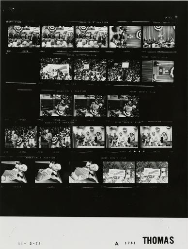 Keywords: Ford A1741 NLGRF photo contact sheet (1974-11-02)(Gerald Ford Library).jpg White House Photographic Office WHPO is housed at the Gerald R Ford Presidential Library a branch of the National Archives and Records Administration NARA <br/><br/> This file is a 200 dpi photo contact sheet having images from roll of film A1741 of the August 9 1974 - January 20 1977 Gerald R Ford White House Photographic Office Series A0001-A9999 and B0001-B2886 photographs <br/><br/> The date on the photo contact sheet is the date the roll of film was processed not necessarily the date the photographs were taken See table below for additional details 1974-11-02 Gerald R Ford Presidential Library Image http //www fordlibrarymuseum gov/library/whphotos/A1741_NLGRF jpg A1741_NLGRF jpg from http //www fordlibrarymuseum gov/library/whphotos/19741102whpo pdf White House Photographs November 2 1974 of the http //www fordlibrarymuseum gov/Library/whphotos/whpo asp White House Photographic Collection page White House Photographic Office WHPO - Thomas PD-USGov Institution Institution Gerald R Ford Presidential Library Table wikitable sortable + Photo contact sheet A1741 U S President Ford Administration Gerald R Ford Library Frame s Tone Subject proper Subject generic Names Geographic Location Photographer Date - 19A-21A BW Campaign Rally for Mayor Garn; Manager for Public and Customer Relations and Aerospace Group Executive for Thiokol Corporation - Salt Lake City Utah seated listening Jack Ford Steve Ford James Brown Jennifer Brown Lukash Salt Lake City UT University of Utah Special Events Center Thomas 1974-11-02 - 22A-24A BW Campaign Rally for Mayor Garn - Salt Lake City Utah speaking at podium; close-up GRF Salt Lake City UT University of Utah Special Events Center Thomas 1974-11-02 - 25A-26A BW Campaign Rally for Mayor Garn - Salt Lake City Utah Veterans standing holding signs favoring GI Benefits Crowd Salt Lake City UT University of Utah Special Events Center Thomas 1974-11-02 - 2A-4A BW Campaign Rally for Mayor Garn; Manager for Public and Customer Relations and Aerospace Group Executive for Thiokol Corporation - Salt Lake City Utah Lukash Nessen Cheney standing others standing applauding Jack Ford Steve Ford Mr Mrs James Brown Jennifer Brown Lukash Nessen Cheney Salt Lake City UT University of Utah Special Events Center Thomas 1974-11-02 - 5A-6A BW Campaign Rally for Mayor Garn - Salt Lake City Utah GRF speaking waving at podium; taken from back of room GRF Crowd Salt Lake City UT University of Utah Special Events Center Thomas 1974-11-02 - 7A BW Thomas 1974-11-02 - 8A-10A BW Campaign Rally for Mayor Garn - Salt Lake City Utah Veterans standing holding signs favoring GI Benefits Crowd Salt Lake City UT University of Utah Special Events Center Thomas 1974-11-02 - 11A BW Campaign Rally for Mayor Garn - Salt Lake City Utah speaking at podium GRF Salt Lake City UT University of Utah Special Events Center Thomas 1974-11-02 - 12A BW Thomas 1974-11-02 - 13A-15A BW Campaign Rally for Mayor Garn - Salt Lake City Utah speaking at podium; taken from right of platform GRF Salt Lake City UT University of Utah Special Events Center Thomas 1974-11-02 - 16A BW speaking at podium; taken from right of platform Thomas 1974-11-02 - 17A-18A BW Campaign Rally for Mayor Garn - Salt Lake City Utah speaking at podium; taken from right of platform guests and crowd in background GRF Platform Guests Crowd Salt Lake City UT University of Utah Special Events Center Thomas 1974-11-02 Gerald R Ford Presidential Library and Museum-cooperation PD-USGov Contact sheets by the Ford White House November 1974 |