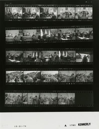 Keywords: Ford A1763 NLGRF photo contact sheet (1974-10-30)(Gerald Ford Library).jpg White House Photographic Office WHPO is housed at the Gerald R Ford Presidential Library a branch of the National Archives and Records Administration NARA <br/><br/> This file is a 200 dpi photo contact sheet having images from roll of film A1763 of the August 9 1974 - January 20 1977 Gerald R Ford White House Photographic Office Series A0001-A9999 and B0001-B2886 photographs <br/><br/> The date on the photo contact sheet is the date the roll of film was processed not necessarily the date the photographs were taken See table below for additional details 1974-10-30 Gerald R Ford Presidential Library Image http //www fordlibrarymuseum gov/library/whphotos/A1763_NLGRF jpg A1763_NLGRF jpg from http //www fordlibrarymuseum gov/library/whphotos/19741030whpo pdf White House Photographs October 30 1974 of the http //www fordlibrarymuseum gov/Library/whphotos/whpo asp White House Photographic Collection page White House Photographic Office WHPO <br/> Creator David Hume Kennerly PD-USGov Institution Institution Gerald R Ford Presidential Library Table wikitable sortable + Photo contact sheet A1763 U S President Ford Administration Gerald R Ford Library Frame s Tone Subject proper Subject generic Names Geographic Location Photographer Date - 2A-4A BW Visit to Doctor -Mrs Ford's Surgeon seated talking GRF Betty Ford Lukash Dr Prouty Ground Floor -Physician's Office Kennerly 1974-10-30 - 5A-8A BW Meeting to Discuss Negotiations Between Bituminous Coal Operators Association BCOA and the United Mine Workers UMW - President and General Counsel BCOA seated near fireplace; various angles and distances; all not in every frame GRF Sec Usery Nicholas Camicia Guy Farmer Raoul-Duval Oval Office Kennerly 1974-10-31 - 9A-15A BW Meeting to Discuss Department of Defense Budget Reductions seated around desk; various angles and distances GRF Sec Schlesinger Ash Donald Ogilvie Scowcroft O'Donnell Oval Office Kennerly 1974-10-31 - 16A BW Prior to Flight to Andrews Air Force Base waving from Marine One; taken from inside helicopter; White House in background GRF South Lawn Kennerly 1974-10-31 - 17A-25A BW Arrival for Campaign Trip to Iowa - Sioux City Iowa greeting handshaking GRF Crowd Sioux City IA Sioux City Municipal Airport Kennerly 1974-10-31 Gerald R Ford Presidential Library and Museum-cooperation PD-USGov Contact sheets by the Ford White House October 1974 Photographs by David Hume Kennerly from 1974 |