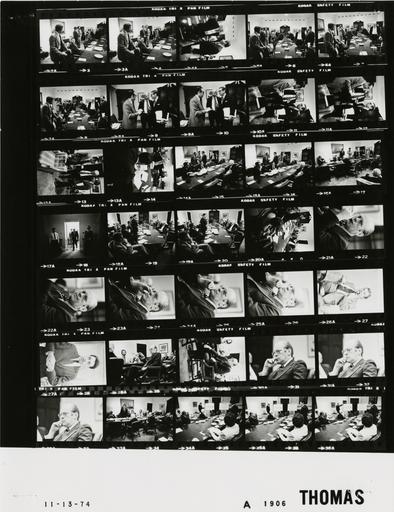 Keywords: Ford A1906 NLGRF photo contact sheet (1974-11-13)(Gerald Ford Library).jpg White House Photographic Office WHPO is housed at the Gerald R Ford Presidential Library a branch of the National Archives and Records Administration NARA <br/><br/> This file is a 200 dpi photo contact sheet having images from roll of film A1906 of the August 9 1974 - January 20 1977 Gerald R Ford White House Photographic Office Series A0001-A9999 and B0001-B2886 photographs <br/><br/> The date on the photo contact sheet is the date the roll of film was processed not necessarily the date the photographs were taken See table below for additional details 1974-11-13 Gerald R Ford Presidential Library Image http //www fordlibrarymuseum gov/library/whphotos/A1906_NLGRF jpg A1906_NLGRF jpg from http //www fordlibrarymuseum gov/library/whphotos/19741113whpo pdf White House Photographs November 13 1974 of the http //www fordlibrarymuseum gov/Library/whphotos/whpo asp White House Photographic Collection page White House Photographic Office WHPO - Thomas PD-USGov Institution Institution Gerald R Ford Presidential Library Table wikitable sortable + Photo contact sheet A1906 U S President Ford Administration Gerald R Ford Library Frame s Tone Subject proper Subject generic Names Geographic Location Photographer Date - 3-8 BW Prior to Domestic Council Issue Review and Welfare Reform Meeting talking seated and standing around table - all not in every frame Secs Weinberger Simon Brennan; Burns Ash Greenspan James Mitchell Phil Campbell Frank Carlucci William Morrill William Taft John Palmer O'Neill Seidman Friedersdorf Marsh Hartmann Cole Cavanaugh Roosevelt Room Thomas 1974-11-13 - 9-13 BW Prior to Domestic Council Issue Review and Welfare Reform Meeting standing talking; Simon holding pipe - various distances Greenspan Burns Simon Roosevelt Room Thomas 1974-11-13 - 14-17 BW Prior to Domestic Council Issue Review and Welfare Reform Meeting talking seated and standing around table - all not in every frame Secs Weinberger Simon Brennan; Burns Ash Greenspan James Mitchell Phil Campbell Frank Carlucci William Morrill William Taft John Palmer O'Neill Seidman Friedersdorf Marsh Hartmann Cole Cavanaugh Roosevelt Room Thomas 1974-11-13 - 18 BW Prior to Domestic Council Issue Review and Welfare Reform Meeting walking toward Roosevelt Room GRF Secret Service White House Hallway Thomas 1974-11-13 - 19-21 BW Domestic Council Issue Review and Welfare Reform Meeting seated around table - all not in every frame GRF Secs Weinberger Simon Brennan; Burns Ash Greenspan James Mitchell Phil Campbell Frank Carlucci William Morrill William Taft John Palmer O'Neill Seidman Friedersdorf Marsh Hartmann Cole Cavanaugh Roosevelt Room Thomas 1974-11-13 - 22-26 BW Domestic Council Issue Review and Welfare Reform Meeting seated listening -smoking pipe wearing glasses GRF Roosevelt Room Thomas 1974-11-13 - 27 BW Domestic Council Issue Review and Welfare Reform Meeting seated listening -smoking pipe Hartmann Roosevelt Room Thomas 1974-11-13 - 28 BW Domestic Council Issue Review and Welfare Reform Meeting seated listening Sec Weinberger Roosevelt Room Thomas 1974-11-13 - 29-30 BW Domestic Council Issue Review and Welfare Reform Meeting seated speaking gesturing - wearing glasses GRF Others Roosevelt Room Thomas 1974-11-13 - 31-33 BW Domestic Council Issue Review and Welfare Reform Meeting seated listening -chin in hand wearing glasses GRF Roosevelt Room Thomas 1974-11-13 - 34 BW Domestic Council Issue Review and Welfare Reform Meeting Weinberger standing talking; others seated - all not in frame GRF Secs Weinberger Simon Brennan; Burns Ash Greenspan James Mitchell Phil Campbell Frank Carlucci William Morrill William Taft John Palmer O'Neill Seidman Friedersdorf Marsh Hartmann Cole Cavanaugh Roosevelt Room Thomas 1974-11-13 - 35-37 BW Domestic Council Issue Review and Welfare Reform Meeting Weinberger standing talking back to camera; others seated looking at charts on easel - all not in every frame GRF Secs Weinberger Simon Brennan; Burns Ash Greenspan James Mitchell Phil Campbell Frank Carlucci William Morrill William Taft John Palmer O'Neill Seidman Friedersdorf Marsh Hartmann Cole Cavanaugh Roosevelt Room Thomas 1974-11-13 Gerald R Ford Presidential Library and Museum-cooperation PD-USGov Contact sheets by the Ford White House November 1974 |