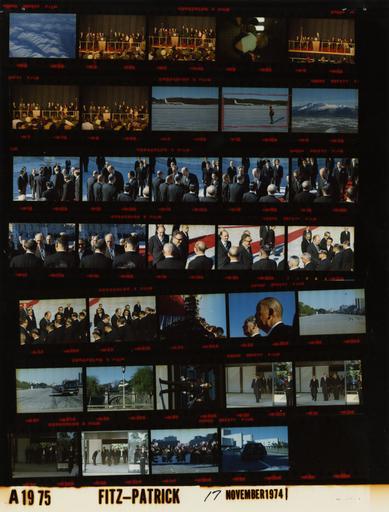 | Keywords: Ford A1975 NLGRF photo contact sheet (1974-11-17)(Gerald Ford Library).jpg White House Photographic Office WHPO is housed at the Gerald R Ford Presidential Library a branch of the National Archives and Records Administration NARA <br/><br/> This file is a 200 dpi photo contact sheet having images from roll of film A1975 of the August 9 1974 - January 20 1977 Gerald R Ford White House Photographic Office Series A0001-A9999 and B0001-B2886 photographs <br/><br/> The date on the photo contact sheet is the date the roll of film was processed not necessarily the date the photographs were taken See table below for additional details 1974-11-17 Gerald R Ford Presidential Library Image http //www fordlibrarymuseum gov/library/whphotos/A1975_NLGRF jpg A1975_NLGRF jpg from http //www fordlibrarymuseum gov/library/whphotos/19741117whpo pdf White House Photographs November 17 1974 of the http //www fordlibrarymuseum gov/Library/whphotos/whpo asp White House Photographic Collection page White House Photographic Office WHPO - Fitz-Patrick PD-USGov Institution Institution Gerald R Ford Presidential Library Table wikitable sortable + Photo contact sheet A1975 U S President Ford Administration Gerald R Ford Library Frame s Tone Subject proper Subject generic Names Geographic Location Photographer Date - 2 Color Flight from Andrews Air Force Base to Elmendorf Air Force Base View of Alaskan mountains Chartered TWA Media Plane Fitz-Patrick 1974-11-17 - 3-4 Color Remarks to Air Force Personnel and Dependents During Stop-over During Trip to Japan -Anchorage Alaska GRF at podium others seated GRF Platform Guests Crowd Anchorage AK Elmendorf Air Force Base -Hangar 5 Fitz-Patrick 1974-11-17 - 5 Color Remarks to Air Force Personnel and Dependents During Stop-over During Trip to Japan -Anchorage Alaska child seated on father's shoulders - taken from behind Child Parent Anchorage AK Elmendorf Air Force Base -Hangar 5 Fitz-Patrick 1974-11-17 - 6-8 Color Remarks to Air Force Personnel and Dependents During Stop-over During Trip to Japan -Anchorage Alaska GRF at podium others seated GRF Platform Guests Crowd Anchorage AK Elmendorf Air Force Base -Hangar 5 Fitz-Patrick 1974-11-17 - 9-10 Color Prior to Departure After Stop-over During Trip to Japan - Anchorage Alaska Air Force One taxiing Anchorage AK Elmendorf Air Force Base -Hangar 5 Fitz-Patrick 1974-11-17 - 11 Color Flight from Elmendorf Air Force Base to Tokyo International Airport View of Alaskan mountains Chartered TWA Media Plane Fitz-Patrick 1974-11-17 - 29 Color Trip to Japan; 1st Visit to Japan by Sitting U S President; State Call at the Imperial Palace; Local Time standing near limousine Police Officer Tokyo Japan Imperial Palace - Outside Fitz-Patrick 1974-11-19 - 30-31 Color Trip to Japan; 1st Visit to Japan by Sitting U S President; State Call at the Imperial Palace; Local Time walking U S Japanese Officials Tokyo Japan Imperial Palace - Outside Fitz-Patrick 1974-11-19 - 32-33 Color Trip to Japan; 1st Visit to Japan by Sitting U S President; State Call at the Imperial Palace; Local Time greeting handshaking bowing -morning coats; formal wear GRF U S Japanese Officials Tokyo Japan Imperial Palace - Outside Fitz-Patrick 1974-11-19 - 12-18 Color Trip to Japan; 1st Visit to Japan by Sitting U S President; Arrival Ceremony; Local Time greeting handshaking bowing -morning coats; formal wear GRF Japanese Officials Tokyo Japan Akasaka Palace Fitz-Patrick 1974-11-19 - 19-20 Color Trip to Japan; 1st Visit to Japan by Sitting U S President; Arrival Ceremony; Local Time greeting handshaking bowing -morning coats; formal wear Kissinger Japanese Officials Tokyo Japan Akasaka Palace Fitz-Patrick 1974-11-19 - 21-24 Color Trip to Japan; 1st Visit to Japan by Sitting U S President; Arrival Ceremony; Local Time greeting handshaking standing -morning coats; formal wear various angles; Kissinger in frames 22 and 23 GRF Kissinger Japanese Officials Tokyo Japan Akasaka Palace Fitz-Patrick 1974-11-19 - 25 Color Trip to Japan; 1st Visit to Japan by Sitting U S President; Arrival Ceremony; Local Time standing -head and shoulder portrait s taken from below Japanese Officials Tokyo Japan Akasaka Palace Fitz-Patrick 1974-11-19 - 26-28 Color Trip to Japan; 1st Visit to Japan by Sitting U S President; Motorcade to the Imperial Palace; Local Time Tokyo Japan Street Scenes Fitz-Patrick 1974-11-19 - 34 Color Trip to Japan; 1st Visit to Japan by Sitting U S President; State Call at the Imperial Palace; Local Time standing behind barricade; holding signs waving U S and Japanese Flags Crowd Tokyo Japan Imperial Palace - Outside Fitz-Patrick 1974-11-19 - 35 Color Trip to Japan; 1st Visit to Japan by Sitting U S President; Motorcade From the Imperial Palace; Local Time Tokyo Japan Street Scene Fitz-Patrick 1974-11-19 Gerald R Ford Presidential Library and Museum-cooperation PD-USGov Contact sheets by the Ford White House November 1974 |