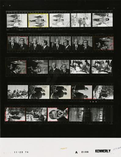 | Keywords: Ford A2106 NLGRF photo contact sheet (1974-11-23)(Gerald Ford Library).jpg White House Photographic Office WHPO is housed at the Gerald R Ford Presidential Library a branch of the National Archives and Records Administration NARA <br/><br/> This file is a 200 dpi photo contact sheet having images from roll of film A2106 of the August 9 1974 - January 20 1977 Gerald R Ford White House Photographic Office Series A0001-A9999 and B0001-B2886 photographs <br/><br/> The date on the photo contact sheet is the date the roll of film was processed not necessarily the date the photographs were taken See table below for additional details 1974-11-23 Gerald R Ford Presidential Library Image http //www fordlibrarymuseum gov/library/whphotos/A2106_NLGRF jpg A2106_NLGRF jpg from http //www fordlibrarymuseum gov/library/whphotos/19741123whpo pdf White House Photographs November 23 1974 of the http //www fordlibrarymuseum gov/Library/whphotos/whpo asp White House Photographic Collection page White House Photographic Office WHPO <br/> Creator David Hume Kennerly PD-USGov Institution Institution Gerald R Ford Presidential Library Table wikitable sortable + Photo contact sheet A2106 U S President Ford Administration Gerald R Ford Library Frame s Tone Subject proper Subject generic Names Geographic Location Photographer Date - 2A-6A BW Trip to the Union of Soviet Socialist Republics -Prior to Meeting with General Secretary Leonid Brezhnev - Local Time walking towards Conference Hall; moving towards camera - GRF wearing wolfskin coat and Russian wool cap GRF Barrett Secret Service Others Vladivostok U S S R Okeansky Sanitarium -Outside Kennerly 1974-11-23 - 7A-14A BW Trip to the Union of Soviet Socialist Republics -Prior to Meeting with General Secretary - Local Time standing talking laughing smiling; Brezhnev gesturing holding cigarette in some frames GRF Brezhnev Vladivostok U S S R Okeansky Sanitarium -Conference Hall Kennerly 1974-11-23 - 15A-16A BW Trip to the Union of Soviet Socialist Republics -Meeting to Discuss Nuclear Arms Limitations and Signing Joint Communique - Local Time seated at table across from American delegation not shown Brezhnev Andrei Gromyko Amb Dobrynin Victor Sukhrodev Others Vladivostok U S S R Okeansky Sanitarium -Conference Hall Kennerly 1974-11-23 - 17A BW Trip to the Union of Soviet Socialist Republics -Meeting to Discuss Nuclear Arms Limitations and Signing Joint Communique - Local Time seated at table across from Soviet delegation not shown GRF Sonnenfeldt Kissinger Amb Stoessel Vladivostok U S S R Okeansky Sanitarium -Conference Hall Kennerly 1974-11-23 - 18A-22A BW Trip to the Union of Soviet Socialist Republics -Break During Meeting to Discuss Nuclear Arms Limitations and Signing Joint Communique - Local Time standing talking; backs to camera in several frames - various distances GRF Kissinger Vladivostok U S S R Okeansky Sanitarium -Conference Hall Kennerly 1974-11-23 - 23A BW Trip to the Union of Soviet Socialist Republics -Meeting to Discuss Nuclear Arms Limitations and Signing Joint Communique - Local Time seated at table across from Soviet delegation not shown GRF Kissinger Vladivostok U S S R Okeansky Sanitarium -Conference Hall Kennerly 1974-11-23 - 24A BW Trip to the Union of Soviet Socialist Republics Local Time head in hands eyes closed - head and shoulder portrait s Cheney Vladivostok U S S R Okeansky Sanitarium Kennerly 1974-11-23 - 25A-26A BW Trip to the Union of Soviet Socialist Republics Local Time walking across snow; silhouette Unidentified Man Vladivostok U S S R Okeansky Sanitarium -Outside Kennerly 1974-11-23 Gerald R Ford Presidential Library and Museum-cooperation PD-USGov Contact sheets by the Ford White House November 1974 Photographs by David Hume Kennerly from 1974 |