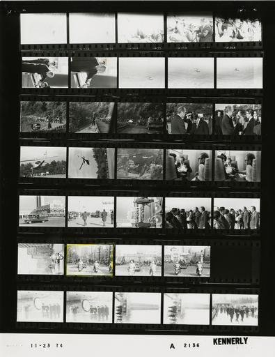 | Keywords: Ford A2136 NLGRF photo contact sheet (1974-11-22)(Gerald Ford Library).jpg White House Photographic Office WHPO is housed at the Gerald R Ford Presidential Library a branch of the National Archives and Records Administration NARA <br/><br/> This file is a 200 dpi photo contact sheet having images from roll of film A2136 of the August 9 1974 - January 20 1977 Gerald R Ford White House Photographic Office Series A0001-A9999 and B0001-B2886 photographs <br/><br/> The date on the photo contact sheet is the date the roll of film was processed not necessarily the date the photographs were taken See table below for additional details 1974-11-22 Gerald R Ford Presidential Library Image http //www fordlibrarymuseum gov/library/whphotos/A2136_NLGRF jpg A2136_NLGRF jpg from http //www fordlibrarymuseum gov/library/whphotos/19741122whpo pdf White House Photographs November 22 1974 of the http //www fordlibrarymuseum gov/Library/whphotos/whpo asp White House Photographic Collection page White House Photographic Office WHPO <br/> Creator David Hume Kennerly PD-USGov Institution Institution Gerald R Ford Presidential Library Table wikitable sortable + Photo contact sheet A2136 U S President Ford Administration Gerald R Ford Library Frame s Tone Subject proper Subject generic Names Geographic Location Photographer Date - 14A BW Trip to the Republic of Korea - Arrival Ceremony - President Republic of Korea - Local Time standing for anthems - backs to camera GRF President Park Chung Hee Seoul South Korea Kimpo International Airport Kennerly 1974-11-22 - 15A-16A BW Trip to the Republic of Korea - Arrival Ceremony - Local Time greeting handshaking GRF Crowd Seoul South Korea Kimpo International Airport Kennerly 1974-11-22 - 17A-20A BW Trip to the Republic of Korea - Motorcade to Chosun Hotel - Local Time confetti covering photograph Police Crowd Limousines Seoul South Korea Downtown Street Kennerly 1974-11-22 - 21A BW Trip to the Republic of Korea - Local Time Seoul South Korea Kennerly 1974-11-22 - 22A-26A BW Trip to the Republic of Korea - Visit to Madame Park's Tomb -Chief Custodian of Cemetery - Local Time standing near tomb walking from tomb GRF Ju Ho Lee Others Seoul South Korea National Cemetery - Madame Park's Tomb Kennerly 1974-11-22 - 27A-28A BW Trip to the Republic of Korea - Visit to Madame Park's Tomb - Local Time signing guest book GRF Seoul South Korea National Cemetery - Madame Park's Tomb Kennerly 1974-11-22 - 29A-33A BW Trip to the Republic of Korea - Flight to Camp Casey - Local Time Helicopter South Korea Marine One Kennerly 1974-11-22 - 34A-36A BW Trip to the Republic of Korea - Visit with Troops of the U S 2nd Division - Local Time GRF wearing 2nd Division letter sweater; Athletes wearing white martial arts clothing with 2nd Division emblem GRF Tae Kwon Do Athletes Others Camp Casey South Korea Hanson Field House Kennerly 1974-11-22 - 2A-4A BW Trip to Japan - 1st Visit to Japan by Sitting U S President - Motorcade to Helicopter Land Pad Local Time Motorcade taken from moving automobile Kyoto Japan Streets Scene Kennerly 1974-11-22 - 5A-6A BW Trip to Japan - 1st Visit to Japan by Sitting U S President -Prior to Flight to Osaka International Airport - Local Time handshaking saying goodbye GRF Others Kyoto Japan Helicopter Landing Pad Kennerly 1974-11-22 - 7A-8A BW Trip to Japan - 1st Visit to Japan by Sitting U S President - Flight to Osaka International Airport - Local Time President's Helicopter ascending Kyoto Japan Helicopter Landing Pad Kennerly 1974-11-22 - 9A BW Trip to Japan - 1st Visit to Japan by Sitting U S President - Flight to Osaka International Airport - Local Time Helicopter flying over Suntory Whisky Distillery Kyoto Japan Marine One Kennerly 1974-11-22 - 10A-11A BW Trip to Japan - 1st Visit to Japan by Sitting U S President - Flight to Osaka International Airport - Local Time seated talking in helicopter Kissinger Nessen Unidentified Man Japan Marine One Kennerly 1974-11-22 - 12A-13A BW Trip to the Republic of Korea - Arrival Ceremony - President Republic of Korea - Local Time GRF and Park standing in back of limousine driving around tarmac - Crowd not in first frame GRF President Park Chung Hee Military Officer Crowd Seoul South Korea Kimpo International Airport Kennerly 1974-11-22 Gerald R Ford Presidential Library and Museum-cooperation PD-USGov Contact sheets by the Ford White House November 1974 Photographs by David Hume Kennerly from 1974 |