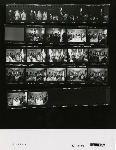 | Keywords: Ford A2196 NLGRF photo contact sheet (1974-11-24)(Gerald Ford Library).jpg White House Photographic Office WHPO is housed at the Gerald R Ford Presidential Library a branch of the National Archives and Records Administration NARA <br/><br/> This file is a 200 dpi photo contact sheet having images from roll of film A2196 of the August 9 1974 - January 20 1977 Gerald R Ford White House Photographic Office Series A0001-A9999 and B0001-B2886 photographs <br/><br/> The date on the photo contact sheet is the date the roll of film was processed not necessarily the date the photographs were taken See table below for additional details 1974-11-24 Gerald R Ford Presidential Library Image http //www fordlibrarymuseum gov/library/whphotos/A2196_NLGRF jpg A2196_NLGRF jpg from http //www fordlibrarymuseum gov/library/whphotos/19741124whpo pdf White House Photographs November 24 1974 of the http //www fordlibrarymuseum gov/Library/whphotos/whpo asp White House Photographic Collection page White House Photographic Office WHPO <br/> Creator David Hume Kennerly PD-USGov Institution Institution Gerald R Ford Presidential Library Table wikitable sortable + Photo contact sheet A2196 U S President Ford Administration Gerald R Ford Library Frame s Tone Subject proper Subject generic Names Geographic Location Photographer Date - 5-6 BW Return from Far East Trip - Andrews Air Force Base Maryland greeting handshaking GRF Betty Ford Others Andrews Air Force Base MD Andrews Air Force Base Kennerly 1974-11-24 - 7-9 BW Return from Far East Trip - Andrews Air Force Base Maryland GRF standing on podium speaking; others standing behind GRF listening GRF Betty Ford Others Andrews Air Force Base MD Andrews Air Force Base Kennerly 1974-11-24 - 10 BW Kennerly 1974-11-24 - 11-12 BW Prior to Thanksgiving Brunch - 1930 Grand Rapids South High School Football Team standing talking - all not in every frame GRF 30-30 Club Members Spouses Blue Room Kennerly 1974-11-28 - 13-14 BW Thanksgiving Brunch -1930 Grand Rapids South High School Football Team standing for grace - all not in every frame GRF 30-30 Club Members Spouses Blue Room Kennerly 1974-11-28 - 15-26 BW Thanksgiving Brunch -1930 Grand Rapids South High School Football Team seated eating - all not in every frame; long shots GRF 30-30 Club Members Spouses Blue Room Kennerly 1974-11-28 Gerald R Ford Presidential Library and Museum-cooperation PD-USGov Contact sheets by the Ford White House November 1974 Photographs by David Hume Kennerly from 1974 |