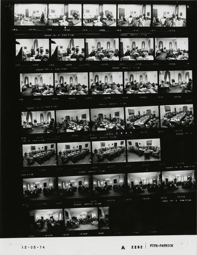 | Keywords: Ford A2282 NLGRF photo contact sheet (1974-12-04)(Gerald Ford Library).jpg White House Photographic Office WHPO is housed at the Gerald R Ford Presidential Library a branch of the National Archives and Records Administration NARA <br/><br/> This file is a 200 dpi photo contact sheet having images from roll of film A2282 of the August 9 1974 - January 20 1977 Gerald R Ford White House Photographic Office Series A0001-A9999 and B0001-B2886 photographs <br/><br/> The date on the photo contact sheet is the date the roll of film was processed not necessarily the date the photographs were taken See table below for additional details 1974-12-04 Gerald R Ford Presidential Library Image http //www fordlibrarymuseum gov/library/whphotos/A2282_NLGRF jpg A2282_NLGRF jpg from http //www fordlibrarymuseum gov/library/whphotos/19741204whpo pdf White House Photographs December 4 1974 of the http //www fordlibrarymuseum gov/Library/whphotos/whpo asp White House Photographic Collection page White House Photographic Office WHPO - Fitz-Patrick PD-USGov Institution Institution Gerald R Ford Presidential Library Table wikitable sortable + Photo contact sheet A2282 U S President Ford Administration Gerald R Ford Library Frame s Tone Subject proper Subject generic Names Geographic Location Photographer Date - 3A-18A BW College Seminar Group Warren and Hushen standing talking; others seated Warren Hushen Students White House Room Fitz-Patrick 1974-12-04 - 19A-26A BW Printers Group seated around table Seidman talking Baroody Seidman Printers Others Roosevelt Room Fitz-Patrick 1974-12-04 - 27A BW Fitz-Patrick 1974-12-04 - 28A-35A BW Bipartisan Breakfast for Defeated Members of Congress seated around tables; eating talking - all not in every frame long shots GRF Sens Cook Dominick; Reps Dorn Roy Mallary Owens Denholm Luken Veysey Brotzman Blackburn Hanrahan Landgrebe Bray Zion Dennis Hudnut Scherle Cronin Huber Shoup Towell Hunt Sandman Widnall Maraziti Grover King Others State Dining Room Fitz-Patrick 1974-12-05 Gerald R Ford Presidential Library and Museum-cooperation PD-USGov Contact sheets by the Ford White House December 1974 |