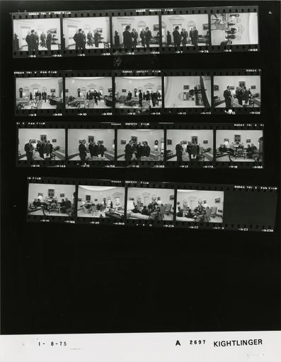 | Keywords: Ford A2697 NLGRF photo contact sheet (1975-01-08)(Gerald Ford Library).jpg White House Photographic Office WHPO is housed at the Gerald R Ford Presidential Library a branch of the National Archives and Records Administration NARA <br/><br/> This file is a 200 dpi photo contact sheet having images from roll of film A2697 of the August 9 1974 - January 20 1977 Gerald R Ford White House Photographic Office Series A0001-A9999 and B0001-B2886 photographs <br/><br/> The date on the photo contact sheet is the date the roll of film was processed not necessarily the date the photographs were taken See table below for additional details 1975-01-08 Gerald R Ford Presidential Library Image http //www fordlibrarymuseum gov/library/whphotos/A2697_NLGRF jpg A2697_NLGRF jpg from http //www fordlibrarymuseum gov/library/whphotos/19750108whpo pdf White House Photographs January 8 1975 of the http //www fordlibrarymuseum gov/Library/whphotos/whpo asp White House Photographic Collection page White House Photographic Office WHPO - Kightlinger PD-USGov Institution Institution Gerald R Ford Presidential Library Table wikitable sortable + Photo contact sheet A2697 U S President Ford Administration Gerald R Ford Library Frame s Tone Subject proper Subject generic Names Geographic Location Photographer Date - 4-11 BW Interview with Washington Post Writers - Asst Managing Editor Rosenfeld ; White House Correspondent Kilpatrick ; National Correspondent Johnson ; News Staff Member Cannon ; Photographer Johnston greeting handshaking smiling walking toward fireplace -all not in every frame GRF Harry Rosenfeld Carroll Kilpatrick Haynes Johnson Lou Gannon Frank Johnston Oval Office Kightlinger 1975-01-08 - 12 BW Interview with Washington Post Writers standing near bookcase posing GRF Oval Office Kightlinger 1975-01-08 - 13-17 BW Interview with Washington Post Writers - Asst Managing Editor Rosenfeld ; White House Correspondent Kilpatrick ; National Correspondent Johnson ; News Staff Member Cannon ; Photographer Johnston standing talking near fireplace GRF Harry Rosenfeld Carroll Kilpatrick Haynes Johnson Lou Gannon Frank Johnston Oval Office Kightlinger 1975-01-08 - 18-22 BW Interview with Washington Post Writers - Asst Managing Editor Rosenfeld ; White House Correspondent Kilpatrick ; National Correspondent Johnson ; News Staff Member Cannon ; Photographer Johnston seated talking near fireplace GRF Harry Rosenfeld Carroll Kilpatrick Haynes Johnson Lou Gannon Frank Johnston Oval Office Kightlinger 1975-01-08 Gerald R Ford Presidential Library and Museum-cooperation PD-USGov Contact sheets by the Ford White House January 1975 |