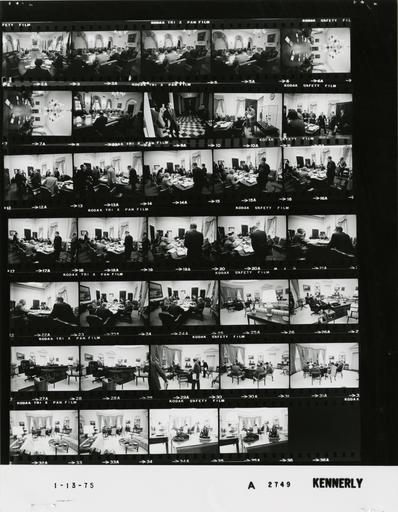 Keywords: Ford A2749 NLGRF photo contact sheet (1975-01-13)(Gerald Ford Library).jpg White House Photographic Office WHPO is housed at the Gerald R Ford Presidential Library a branch of the National Archives and Records Administration NARA <br/><br/> This file is a 200 dpi photo contact sheet having images from roll of film A2749 of the August 9 1974 - January 20 1977 Gerald R Ford White House Photographic Office Series A0001-A9999 and B0001-B2886 photographs <br/><br/> The date on the photo contact sheet is the date the roll of film was processed not necessarily the date the photographs were taken See table below for additional details 1975-01-13 Gerald R Ford Presidential Library Image http //www fordlibrarymuseum gov/library/whphotos/A2749_NLGRF jpg A2749_NLGRF jpg from http //www fordlibrarymuseum gov/library/whphotos/19750113whpo pdf White House Photographs January 13 1975 of the http //www fordlibrarymuseum gov/Library/whphotos/whpo asp White House Photographic Collection page White House Photographic Office WHPO <br/> Creator David Hume Kennerly PD-USGov Institution Institution Gerald R Ford Presidential Library Table wikitable sortable + Photo contact sheet A2749 U S President Ford Administration Gerald R Ford Library Frame s Tone Subject proper Subject generic Names Geographic Location Photographer Date - 2A-8A BW Meeting With Economic Advisers seated around table talking - various angles; all not in every frame GRF Simon Burns Greenspan Ash Hartmann Seidman Cheney Nessen Cabinet Room Kennerly 1975-01-13 - 9A BW Prior to Meeting of the U S President's Commission on CIA Activities Within the United States Rockefeller Commission - Director CIA walking carrying briefcase Colby Old Executive Office Building OEOB -Hallway Kennerly 1975-01-13 - 10A-20A BW Prior to First Meeting of the U S President's Commission on CIA Activities Within the United States Rockefeller Commission standing sitting talking greeting handshaking around table; NAR standing at head of table - various angles; all not in every frame Rockefeller John Connor C Douglas Dillon Erwin Griswold Lane Kirkland Lyman Lemnitzer Ronald Reagan Edgar Shankar Old Executive Office Building OEOB -Vice President's Suite Kennerly 1975-01-13 - 21A-24A BW First Meeting of the U S President's Commission on CIA Activities Within the United States Rockefeller Commission seated around table talking - various angles; all not in every frame Rockefeller John Connor C Douglas Dillon Erwin Griswold Lane Kirkland Lyman Lemnitzer Ronald Reagan Edgar Shannon Old Executive Office Building OEOB -Vice President's Suite Kennerly 1975-01-13 - 25A-28A BW seated talking on telephone; feet propped on side table in second frame GRF Oval Office Kennerly 1975-01-13 - 29A-35A BW seated around desk talking - walking toward chairs in first frame; various angles and distances GRF Ash Greenspan Butz Ogilvie Scowcroft Oval Office Kennerly 1975-01-13 Gerald R Ford Presidential Library and Museum-cooperation PD-USGov Contact sheets by the Ford White House January 1975 Photographs by David Hume Kennerly from 1975 |