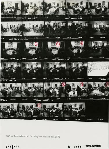 | Keywords: Ford A2863 NLGRF photo contact sheet (1975-01-21)(Gerald Ford Library).jpg White House Photographic Office WHPO is housed at the Gerald R Ford Presidential Library a branch of the National Archives and Records Administration NARA <br/><br/> This file is a 200 dpi photo contact sheet having images from roll of film A2863 of the August 9 1974 - January 20 1977 Gerald R Ford White House Photographic Office Series A0001-A9999 and B0001-B2886 photographs <br/><br/> The date on the photo contact sheet is the date the roll of film was processed not necessarily the date the photographs were taken See table below for additional details 1975-01-21 Gerald R Ford Presidential Library Image http //www fordlibrarymuseum gov/library/whphotos/A2863_NLGRF jpg A2863_NLGRF jpg from http //www fordlibrarymuseum gov/library/whphotos/19750121whpo pdf White House Photographs January 21 1975 of the http //www fordlibrarymuseum gov/Library/whphotos/whpo asp White House Photographic Collection page White House Photographic Office WHPO - Fitz-Patrick PD-USGov Institution Institution Gerald R Ford Presidential Library Table wikitable sortable + Photo contact sheet A2863 U S President Ford Administration Gerald R Ford Library Frame s Tone Subject proper Subject generic Names Geographic Location Photographer Date - 3A-21A BW Republican Congressional Leadership Breakfast seated around tables talking eating; White House Waiters in several frames - various angles and distances; all not in every frame GRF Sens Scott Griffin Curtis Tower Young Stafford Stevens; Reps Rhodes Michel Devine Edwards Conable Vander Jagt Cederberg Schneebli Quillen; Simon Rumsfeld Marsh Greenspan Zarb Friedersdorf Cannon Seidman Nessen State Floor - Family Dining Room Fitz-Patrick 1975-01-21 - 22A BW snow on ground; Oval Office in background Rose Garden Fitz-Patrick 1975-01-21 - 23A-31A BW Republican Congressional Leadership Breakfast seated around tables talking eating; White House Waiters in several frames - various angles and distances; all not in every frame GRF Sens Scott Griffin Curtis Tower Young Stafford Stevens; Reps Rhodes Michel Devine Edwards Conable Vander Jagt Cederberg Schneebli Quillen; Simon Rumsfeld Marsh Greenspan Zarb Friedersdorf Cannon Seidman Nessen State Floor - Family Dining Room Fitz-Patrick 1975-01-21 Gerald R Ford Presidential Library and Museum-cooperation PD-USGov Contact sheets by the Ford White House January 1975 |
