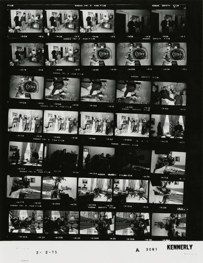 | Keywords: Ford A3061 NLGRF photo contact sheet (1975-02-01)(Gerald Ford Library).jpg White House Photographic Office WHPO is housed at the Gerald R Ford Presidential Library a branch of the National Archives and Records Administration NARA <br/><br/> This file is a 200 dpi photo contact sheet having images from roll of film A3061 of the August 9 1974 - January 20 1977 Gerald R Ford White House Photographic Office Series A0001-A9999 and B0001-B2886 photographs <br/><br/> The date on the photo contact sheet is the date the roll of film was processed not necessarily the date the photographs were taken See table below for additional details 1975-02-01 Gerald R Ford Presidential Library Image http //www fordlibrarymuseum gov/library/whphotos/A3061_NLGRF jpg A3061_NLGRF jpg from http //www fordlibrarymuseum gov/library/whphotos/19750201whpo pdf White House Photographs February 1 1975 of the http //www fordlibrarymuseum gov/Library/whphotos/whpo asp White House Photographic Collection page White House Photographic Office WHPO <br/> Creator David Hume Kennerly PD-USGov Institution Institution Gerald R Ford Presidential Library Table wikitable sortable + Photo contact sheet A3061 U S President Ford Administration Gerald R Ford Library Frame s Tone Subject proper Subject generic Names Geographic Location Photographer Date - 9A-12A BW Hooked Presidental Seal Rug; Sister-in-Law of Gerald R Ford seated holding Presidential Seal Rug; various angles and distances GRF Ellen Ford Second Floor - West Sitting Hall Kennerly 1975-02-01 - 2A-8A BW Half-Brother of Gerald R Ford standing talking; looking at television GRF Dick Ford Second Floor - West Sitting Hall Kennerly 1975-02-02 - 13A-16A BW Half-Brother and Sister-in-Law of Gerald R Ford and Family GRF and BF embracing; others in background GRF Betty Ford Susan Ford; Dick Ford Ellen Ford Laurie Ford Richard Ford Ted Linda Burba Second Floor - West Sitting Hall Kennerly 1975-02-02 - 17A-20A BW Half-Brother and Sister-in-Law of Gerald R Ford and Family standing posing GRF Betty Ford Susan Ford; Dick Ford Ellen Ford Laurie Ford Richard Ford Ted Linda Burba Second Floor - West Sitting Hall Kennerly 1975-02-02 - 21A-22A BW Photo Opportunity with Candace Bergen - American Actress and Photographer standing talking near desk; casual clothes GRF Candice Bergen Oval Office Kennerly 1975-02-02 - 23A-24A BW Photo Opportunity with Candace Bergen - American Actress and Photographer standing talking; GRF holding Presidential Seal Rug; casual clothes GRF Candice Bergen President's Private Office Kennerly 1975-02-02 - 25A-36A BW Pet Golden Retriever GRF seated at desk petting dog; fashion plaid pants ; various angles GRF Liberty Oval Office Kennerly 1975-02-02 Gerald R Ford Presidential Library and Museum-cooperation PD-USGov Contact sheets by the Ford White House February 1975 Photographs by David Hume Kennerly from 1975 Hooked rugs |