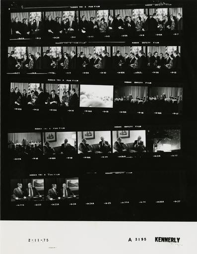 Keywords: Ford A3195 NLGRF photo contact sheet (1975-02-10)(Gerald Ford Library).jpg White House Photographic Office WHPO is housed at the Gerald R Ford Presidential Library a branch of the National Archives and Records Administration NARA <br/><br/> This file is a 200 dpi photo contact sheet having images from roll of film A3195 of the August 9 1974 - January 20 1977 Gerald R Ford White House Photographic Office Series A0001-A9999 and B0001-B2886 photographs <br/><br/> The date on the photo contact sheet is the date the roll of film was processed not necessarily the date the photographs were taken See table below for additional details 1975-02-10 Gerald R Ford Presidential Library Image http //www fordlibrarymuseum gov/library/whphotos/A3195_NLGRF jpg A3195_NLGRF jpg from http //www fordlibrarymuseum gov/library/whphotos/19750210whpo pdf White House Photographs February 10 1975 of the http //www fordlibrarymuseum gov/Library/whphotos/whpo asp White House Photographic Collection page White House Photographic Office WHPO <br/> Creator David Hume Kennerly PD-USGov Institution Institution Gerald R Ford Presidential Library Table wikitable sortable + Photo contact sheet A3195 U S President Ford Administration Gerald R Ford Library Frame s Tone Subject proper Subject generic Names Geographic Location Photographer Date - 2A-13A BW Swearing in of Director of Office of Management and Budget OMB GRF at microphone in 2A3A; standing talking; Lynn at microphone in frames 11A-13A GRF Lynn Joan Lynn William Rehnquist; Others Cabinet Room Kennerly 1975-02-10 - 14A BW Kennerly 1975-02-10 - 15A-17A BW Trip to Houston Texas -Houston Chamber of Commerce Energy/Economic Conference - Houston Texas GRF speaking from lectern; various angles and distances; all not in every frame GRF Others Houston TX Shamrock Hilton Hotel - Emerald Room Kennerly 1975-02-10 - 18A-20A BW Trip to Houston Texas -Meeting with Former Governor of Texas and Attorney with Vinson Elkins Searls Connally and Smith seated talking; close ups GRF John Connolly Houston TX Shamrock Hilton Hotel - President's Suite Kennerly 1975-02-10 - 21A BW Trip to Houston Texas standing by telephone Military Aide Houston TX Shamrock Hilton Hotel - President's Suite Kennerly 1975-02-10 - 22A-23A BW Trip to Houston Texas standing talking GRF Unidentified Man Houston TX Shamrock Hilton Hotel Kennerly 1975-02-10 Gerald R Ford Presidential Library and Museum-cooperation PD-USGov Contact sheets by the Ford White House February 1975 Photographs by David Hume Kennerly from 1975 |