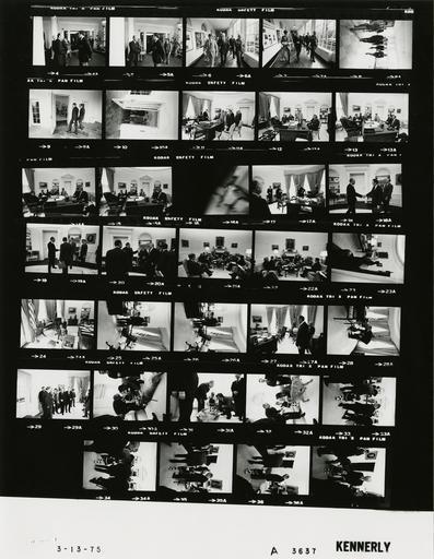 | Keywords: Ford A3637 NLGRF photo contact sheet (1975-03-13)(Gerald Ford Library).jpg White House Photographic Office WHPO is housed at the Gerald R Ford Presidential Library a branch of the National Archives and Records Administration NARA <br/><br/> This file is a 200 dpi photo contact sheet having images from roll of film A3637 of the August 9 1974 - January 20 1977 Gerald R Ford White House Photographic Office Series A0001-A9999 and B0001-B2886 photographs <br/><br/> The date on the photo contact sheet is the date the roll of film was processed not necessarily the date the photographs were taken See table below for additional details 1975-03-13 Gerald R Ford Presidential Library Image http //www fordlibrarymuseum gov/library/whphotos/A3637_NLGRF jpg A3637_NLGRF jpg from http //www fordlibrarymuseum gov/library/whphotos/19750313whpo pdf White House Photographs March 13 1975 of the http //www fordlibrarymuseum gov/Library/whphotos/whpo asp White House Photographic Collection page White House Photographic Office WHPO <br/> Creator David Hume Kennerly PD-USGov Institution Institution Gerald R Ford Presidential Library Table wikitable sortable + Photo contact sheet A3637 U S President Ford Administration Gerald R Ford Library Frame s Tone Subject proper Subject generic Names Geographic Location Photographer Date - 4-5 BW Informal Tour of East Wing Staff Offices handshaking GRF Security Guard East Wing Kennerly 1975-03-13 - 6-7 BW Following Informal Tour of East Wing Staff Offices walking toward camera GRF O'Donnell Others East Wing Colonnade Kennerly 1975-03-13 - 8 BW Following Informal Tour of East Wing Staff Offices walking toward camera GRF O'Donnell Barrett Keiser Others Entrance Hall Kennerly 1975-03-13 - 9-10 BW Following Informal Tour of East Wing Staff Offices entering Oval Office GRF Rumsfeld Colonnade Kennerly 1975-03-13 - 11-15 BW Meeting with Congressional Members to Discuss U S Postal Service standing seated around desk GRF Sens McGee Fong; Reps Henderson Derwinski; Lynn Friedersdorf Oval Office Kennerly 1975-03-13 - 16 BW Kennerly 1975-03-13 - 17-20 BW Meeting with Labor Representatives to Discuss U S Postal Service greeting handshaking standing talking; all not in every frame GRF Bailar Myron Wright Albert Rees Usery Lynn Cannon Oval Office Kennerly 1975-03-13 - 21-22 BW Meeting with Labor Representatives to Discuss U S Postal Service seated talking near fireplace GRF Bailar Myron Wright Albert Rees Usery Lynn Cannon Oval Office Kennerly 1975-03-13 - 23-28 BW Pet Golden Retriever playing with dog near desk GRF Liberty Oval Office Kennerly 1975-03-13 - 29 BW Photo Opportunity with 1975 Easter Seal Poster Child; American Actor standing talking; all not in frame GRF Pamela Jo Baker Herbert Baker Peter Falk Edward Drake; Sens Randolph Byrd; O'Donnell Needham; Liberty Oval Office Kennerly 1975-03-13 - 30-33 BW Photo Opportunity with 1975 Easter Seal Poster Child; American Actor; Pet Golden Retriever playing with dog GRF Pamela Jo Baker Peter Falk Liberty Oval Office Kennerly 1975-03-13 - 24-37 BW Photo Opportunity with 1975 Easter Seal Poster Child; American Actor GRF and Pamela Jo Baker walking holding hands back to camera; all not in every frame GRF Pamela Jo Baker Herbert Baker Peter Falk Edward Drake; Sens Randolph Byrd; O'Donnell Needham Oval Office Kennerly 1975-03-13 Gerald R Ford Presidential Library and Museum-cooperation PD-USGov Contact sheets by the Ford White House March 1975 Photographs by David Hume Kennerly from 1975 |