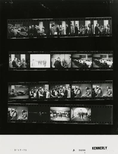 | Keywords: Ford A3696 NLGRF photo contact sheet (1975-03-17)(Gerald Ford Library).jpg White House Photographic Office WHPO is housed at the Gerald R Ford Presidential Library a branch of the National Archives and Records Administration NARA <br/><br/> This file is a 200 dpi photo contact sheet having images from roll of film A3696 of the August 9 1974 - January 20 1977 Gerald R Ford White House Photographic Office Series A0001-A9999 and B0001-B2886 photographs <br/><br/> The date on the photo contact sheet is the date the roll of film was processed not necessarily the date the photographs were taken See table below for additional details 1975-03-17 Gerald R Ford Presidential Library Image http //www fordlibrarymuseum gov/library/whphotos/A3696_NLGRF jpg A3696_NLGRF jpg from http //www fordlibrarymuseum gov/library/whphotos/19750317whpo pdf White House Photographs March 17 1975 of the http //www fordlibrarymuseum gov/Library/whphotos/whpo asp White House Photographic Collection page White House Photographic Office WHPO <br/> Creator David Hume Kennerly PD-USGov Institution Institution Gerald R Ford Presidential Library Table wikitable sortable + Photo contact sheet A3696 U S President Ford Administration Gerald R Ford Library Frame s Tone Subject proper Subject generic Names Geographic Location Photographer Date - 10A BW Dinner with Mid-Northeast Governors - South Bend Indiana lying on sofa unidentified woman South Bend IN University of Notre Dame Library Kennerly 1975-03-17 - 0A BW Eleventh Press Conference -Trip to South Bend Indiana seated Media South Bend IN University of Notre Dame Continuing Education Center Kennerly 1975-03-17 - 1A-5A BW Trip to South Bend Indiana greeting handshaking GRF Mr Mrs Fred Young Others South Bend IN University of Notre Dame Continuing Education Center Kennerly 1975-03-17 - 6A BW Trip to South Bend Indiana walking GRF Others South Bend IN Outside University of Notre Dame Library Kennerly 1975-03-17 - 7A BW Trip to South Bend Indiana greeting handshaking GRF Staff South Bend IN University of Notre Dame Library Kennerly 1975-03-17 - 8A-9A BW Dinner with Mid-Northeast Governors - South Bend Indiana seated at table; all not in every frame GRF Govs Bowen Godwin Moore Milliken Rhodes Carroll; Levi Hartmann Cannon Cheney Nessen Connor Falk Friedersdorf Greenspan Zarb South Bend IN University of Notre Dame Library Kennerly 1975-03-17 - 11A-12A BW Trip to South Bend Indiana GRF signing football GRF Students South Bend IN University of Notre Dame Library Kennerly 1975-03-17 - 13A-15A BW Return Flight from South Bend Indiana seated on plane talking GRF Unidentified Man Air Force One - President's Cabin Kennerly 1975-03-17 - 16A BW Arrival from Andrews Air Force Base waving walking from Marine One - night shot GRF South Lawn Kennerly 1975-03-18 - 17A BW walking GRF Keiser Ground Floor -Diplomatic Reception Room Kennerly 1975-03-18 - 18A BW walking GRF Keiser Others Ground Floor -Corridor Kennerly 1975-03-18 Gerald R Ford Presidential Library and Museum-cooperation PD-USGov Contact sheets by the Ford White House March 1975 Photographs by David Hume Kennerly from 1975 |