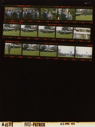 | Keywords: Ford A4131 NLGRF photo contact sheet (1975-04-23)(Gerald Ford Library).jpg White House Photographic Office WHPO is housed at the Gerald R Ford Presidential Library a branch of the National Archives and Records Administration NARA <br/><br/> This file is a 200 dpi photo contact sheet having images from roll of film A4131 of the August 9 1974 - January 20 1977 Gerald R Ford White House Photographic Office Series A0001-A9999 and B0001-B2886 photographs <br/><br/> The date on the photo contact sheet is the date the roll of film was processed not necessarily the date the photographs were taken See table below for additional details 1975-04-23 Gerald R Ford Presidential Library Image http //www fordlibrarymuseum gov/library/whphotos/A4131_NLGRF jpg A4131_NLGRF jpg from http //www fordlibrarymuseum gov/library/whphotos/19750423whpo pdf White House Photographs April 23 1975 of the http //www fordlibrarymuseum gov/Library/whphotos/whpo asp White House Photographic Collection page White House Photographic Office WHPO - Fitz-Patrick PD-USGov Institution Institution Gerald R Ford Presidential Library Table wikitable sortable + Photo contact sheet A4131 U S President Ford Administration Gerald R Ford Library Frame s Tone Subject proper Subject generic Names Geographic Location Photographer Date - 4-5 Color Prior to Marine One Departure for Andrews Air Force Base standing talking; GRF back to camera arm around unidentified man GRF Unidentified Group Rose Garden Fitz-Patrick 1975-04-23 - 6-7 Color Prior to Marine One Departure for Andrews Air Force Base standing talking GRF Unidentified Man Rose Garden Fitz-Patrick 1975-04-23 - 8-12 Color Prior to Departure for Andrews Air Force Base walking toward Marine One; long shots GRF; Kennerly military South Lawn Fitz-Patrick 1975-04-23 - 13 Color Prior to GRF's Departure for Andrews Air Force Base waving; taken from ground level Betty Ford Truman Balcony Fitz-Patrick 1975-04-23 - 14 Color Prior to GRF's Departure for Andrews Air Force Base standing; Marine One in background Secret Service South Lawn Fitz-Patrick 1975-04-23 - 15-18 Color Departure for Andrews Air Force Base Marine One ascending; flying away from camera; Washington Monument in last two frames South Lawn Fitz-Patrick 1975-04-23 Gerald R Ford Presidential Library and Museum-cooperation PD-USGov Contact sheets by the Ford White House April 1975 |