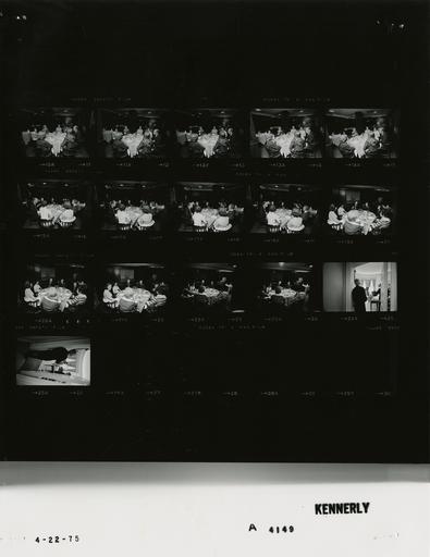 Keywords: Ford A4149 NLGRF photo contact sheet (1975-04-22)(Gerald Ford Library).jpg White House Photographic Office WHPO is housed at the Gerald R Ford Presidential Library a branch of the National Archives and Records Administration NARA <br/><br/> This file is a 200 dpi photo contact sheet having images from roll of film A4149 of the August 9 1974 - January 20 1977 Gerald R Ford White House Photographic Office Series A0001-A9999 and B0001-B2886 photographs <br/><br/> The date on the photo contact sheet is the date the roll of film was processed not necessarily the date the photographs were taken See table below for additional details 1975-04-22 Gerald R Ford Presidential Library Image http //www fordlibrarymuseum gov/library/whphotos/A4149_NLGRF jpg A4149_NLGRF jpg from http //www fordlibrarymuseum gov/library/whphotos/19750422whpo pdf White House Photographs April 22 1975 of the http //www fordlibrarymuseum gov/Library/whphotos/whpo asp White House Photographic Collection page White House Photographic Office WHPO <br/> Creator David Hume Kennerly PD-USGov Institution Institution Gerald R Ford Presidential Library Table wikitable sortable + Photo contact sheet A4149 U S President Ford Administration Gerald R Ford Library Frame s Tone Subject proper Subject generic Names Geographic Location Photographer Date - 10A-23A BW Luncheon With Secretaries In Honor of National Secretaries Week seated around table; various angles GRF Ann Whitman Mildred Leonard Downton Yates Helen Donaldson Mary Rawlins Conference Dining Room - White House Staff Mess Kennerly 1975-04-22 - 24A-25A BW GRF in background man in doorway from Scheduling and Advance Office GRF Unidentified Man Theis Oval Office Kennerly 1975-04-22 Gerald R Ford Presidential Library and Museum-cooperation PD-USGov Contact sheets by the Ford White House April 1975 Photographs by David Hume Kennerly from 1975 |
