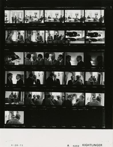 Keywords: Ford A4252 NLGRF photo contact sheet (1975-04-28)(Gerald Ford Library).jpg White House Photographic Office WHPO is housed at the Gerald R Ford Presidential Library a branch of the National Archives and Records Administration NARA <br/><br/> This file is a 200 dpi photo contact sheet having images from roll of film A4252 of the August 9 1974 - January 20 1977 Gerald R Ford White House Photographic Office Series A0001-A9999 and B0001-B2886 photographs <br/><br/> The date on the photo contact sheet is the date the roll of film was processed not necessarily the date the photographs were taken See table below for additional details 1975-04-28 Gerald R Ford Presidential Library Image http //www fordlibrarymuseum gov/library/whphotos/A4252_NLGRF jpg A4252_NLGRF jpg from http //www fordlibrarymuseum gov/library/whphotos/19750428whpo pdf White House Photographs April 28 1975 of the http //www fordlibrarymuseum gov/Library/whphotos/whpo asp White House Photographic Collection page White House Photographic Office WHPO - Kightlinger PD-USGov Institution Institution Gerald R Ford Presidential Library Table wikitable sortable + Photo contact sheet A4252 U S President Ford Administration Gerald R Ford Library Frame s Tone Subject proper Subject generic Names Geographic Location Photographer Date - 6A BW Meeting with Governor of North Carolina greeting handshaking GRF Gov Holshouser Oval Office Kightlinger 1975-04-28 - 7A-10A BW Meeting with Governor of North Carolina seated around desk; Rumsfeld in first frame GRF Gov Holshouser; Rumsfeld Oval Office Kightlinger 1975-04-28 - 11A-12A BW Prior to Economy/Energy Meeting standing talking Seidman Greenspan Cabinet Room Kightlinger 1975-04-28 - 13A BW Prior to Economy/Energy Meeting standing talking in groups Greenspan Morton Marsh Zarb Cabinet Room Kightlinger 1975-04-28 - 14A-15A BW Prior to Economy/Energy Meeting standing talking Cannon Scowcroft Cabinet Room Kightlinger 1975-04-28 - 16A BW Prior to Economy/Energy Meeting standing leaning on chairs Lynn Morton Cabinet Room Kightlinger 1975-04-28 - 17A-18A BW Prior to Economy/Energy Meeting standing talking; man's back to camera Burns Greenspan Unidentified Man Cabinet Room Kightlinger 1975-04-28 - 19A-23A BW Prior to Economy/Energy Meeting talking; closing up; second frame dark Rockefeller Cannon Cabinet Room Kightlinger 1975-04-28 - 24A BW Prior to Economy/Energy Meeting standing talking Rockefeller Burns Cabinet Room Kightlinger 1975-04-28 - 25A BW Prior to Economy/Energy Meeting standing talking; leaning on chairs Simon Lynn Cabinet Room Kightlinger 1975-04-28 - 26A-27A BW Prior to Economy/Energy Meeting standing talking Rockefeller Greenspan Burns Cabinet Room Kightlinger 1975-04-28 - 28A-30A BW Prior to Economy/Energy Meeting standing talking; backs to camera Rockefeller Burns Cabinet Room Kightlinger 1975-04-28 Gerald R Ford Presidential Library and Museum-cooperation PD-USGov Contact sheets by the Ford White House April 1975 |