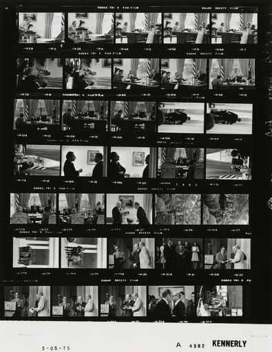| Keywords: Ford A4382 NLGRF photo contact sheet (1975-05-05)(Gerald Ford Library).jpg White House Photographic Office WHPO is housed at the Gerald R Ford Presidential Library a branch of the National Archives and Records Administration NARA <br/><br/> This file is a 200 dpi photo contact sheet having images from roll of film A4382 of the August 9 1974 - January 20 1977 Gerald R Ford White House Photographic Office Series A0001-A9999 and B0001-B2886 photographs <br/><br/> The date on the photo contact sheet is the date the roll of film was processed not necessarily the date the photographs were taken See table below for additional details 1975-05-05 Gerald R Ford Presidential Library Image http //www fordlibrarymuseum gov/library/whphotos/A4382_NLGRF jpg A4382_NLGRF jpg from http //www fordlibrarymuseum gov/library/whphotos/19750505whpo pdf White House Photographs May 5 1975 of the http //www fordlibrarymuseum gov/Library/whphotos/whpo asp White House Photographic Collection page White House Photographic Office WHPO <br/> Creator David Hume Kennerly PD-USGov Institution Institution Gerald R Ford Presidential Library Table wikitable sortable + Photo contact sheet A4382 U S President Ford Administration Gerald R Ford Library Frame s Tone Subject proper Subject generic Names Geographic Location Photographer Date - 27A-28A BW walking laughing; O'Donnell in first frame only GRF O'Donnell Lukash Secret Service White House Entrance near Treasury Building Kennerly 1975-05-05 - 29A BW Ceremony to Present Alexander Hamilton Award to Former Secretary Shultz and Portrait Unveiling standing near podium GRF Simon George Shultz Washington DC Department of the Treasury - Room 4121 Kennerly 1975-05-05 - 30A BW Ceremony to Present Alexander Hamilton Award to Former Secretary Shultz and Portrait Unveiling standing listening Kissinger Others Washington DC Department of the Treasury - Room 4121 Kennerly 1975-05-05 - 32A-35A BW Ceremony to Present Alexander Hamilton Award to Former Secretary Shultz and Portrait Unveiling standing near podium GRF Simon George Shultz Washington DC Department of the Treasury - Room 4121 Kennerly 1975-05-05 - 36A BW Ceremony to Present Alexander Hamilton Award to Former Secretary Shultz and Portrait Unveiling moving; head and shoulder profile GRF Washington DC Department of the Treasury - Room 4121 Kennerly 1975-05-05 - 37A BW seated talking on telephone; feet on table Rumsfeld Rumsfeld's Office Kennerly 1975-05-05 - 2A-6A BW seated around desk GRF Perry Young Oval Office Kennerly 1975-05-05 - 7A-8A BW GRF seated at desk; Susan in background taking photographs GRF Susan Ford Oval Office Kennerly 1975-05-05 - 9A-14A BW seated around desk; various angles; Susan Ford taking photos in two frames GRF Rumsfeld Oval Office Kennerly 1975-05-05 - 15A-16A BW walking Carrying briefcase; back to camera Kissinger Scheduling and Advance Office Kennerly 1975-05-05 - 17A BW GRF seated at desk; Susan in background taking photographs GRF Susan Ford Oval Office Kennerly 1975-05-05 - 18A-19A BW standing talking; RN with cigarette dangling from mouth Kissinger Nessen Scheduling and Advance Office Kennerly 1975-05-05 - 20A-23A BW seated around desk; taken toward GRF; all not in frames GRF Marsh Hartmann Greener Nessen Rumsfeld Friedersdorf Oval Office Kennerly 1975-05-05 - 24A BW standing talking; SF holding camera GRF Burns Susan Ford Oval Office Kennerly 1975-05-05 - 25A-26A BW walking smoking pipe Rumsfeld Garden Kennerly 1975-05-05 Gerald R Ford Presidential Library and Museum-cooperation PD-USGov Contact sheets by the Ford White House May 1975 Photographs by David Hume Kennerly from 1975 |