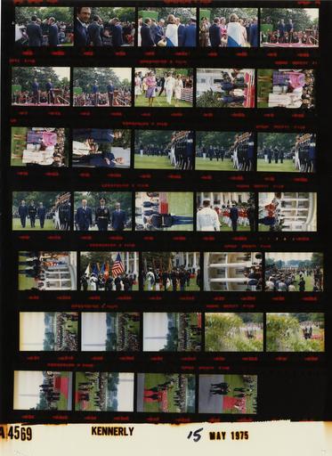 Keywords: Ford A4569 NLGRF photo contact sheet (1975-05-15)(Gerald Ford Library).jpg White House Photographic Office WHPO is housed at the Gerald R Ford Presidential Library a branch of the National Archives and Records Administration NARA <br/><br/> This file is a 200 dpi photo contact sheet having images from roll of film A4569 of the August 9 1974 - January 20 1977 Gerald R Ford White House Photographic Office Series A0001-A9999 and B0001-B2886 photographs <br/><br/> The date on the photo contact sheet is the date the roll of film was processed not necessarily the date the photographs were taken See table below for additional details 1975-05-15 Gerald R Ford Presidential Library Image http //www fordlibrarymuseum gov/library/whphotos/A4569_NLGRF jpg A4569_NLGRF jpg from http //www fordlibrarymuseum gov/library/whphotos/19750515whpo pdf White House Photographs May 15 1975 of the http //www fordlibrarymuseum gov/Library/whphotos/whpo asp White House Photographic Collection page White House Photographic Office WHPO <br/> Creator David Hume Kennerly PD-USGov Institution Institution Gerald R Ford Presidential Library Table wikitable sortable + Photo contact sheet A4569 U S President Ford Administration Gerald R Ford Library Frame s Tone Subject proper Subject generic Names Geographic Location Photographer Date - 2A-5A Color State Arrival for the Shah of Iran greeting handshaking near limousine; all not in every frame GRF Betty Ford Kissinger Shah Mohammad Reza Pahlavi Shahbanou Farah Pahlavi Others South Driveway Kennerly 1975-05-15 - 6A-8A Color State Arrival Ceremony for the Shah of Iran standing on podium; crowd in background GRF Shah Mohammad Reza Pahlavi South Lawn Kennerly 1975-05-15 - 9A Color State Arrival Ceremony for the Shah of Iran walking to positions; military aide in background Betty Ford; Shahbanou Farah Pahlavi South Lawn Kennerly 1975-05-15 - 10A Color State Arrival Ceremony for the Shah of Iran standing on podium; White House in background GRF Shah Mohammad Reza Pahlavi South Lawn Kennerly 1975-05-15 - 11A-12A Color State Arrival Ceremony for the Shah of Iran standing; crowd in background Betty Ford; Shahbanou Farah Pahlavi South Lawn Kennerly 1975-05-15 - 13A Color State Arrival Ceremony for the Shah of Iran standing on podium; GRF with hand over heart; White House in background GRF Shah Mohammad Reza Pahlavi South Lawn Kennerly 1975-05-15 - 14A-18A Color State Arrival Ceremony for the Shah of Iran walking past Honor Guard; moving toward camera GRF Shah Mohammad Reza Pahlavi; Captain of the Guard Honor Guard South Lawn Kennerly 1975-05-15 - 19A Color State Arrival Ceremony for the Shah of Iran standing on podium; White House in background; Captain in foreground GRF Shah Mohammad Reza Pahlavi; Captain of the Guard South Lawn Kennerly 1975-05-15 - 20A-24A Color State Arrival Ceremony for the Shah of Iran passing in review; various angles and distances; all not in every frame Honor Guard Marine Corps Band South Lawn Kennerly 1975-05-15 - 25A Color State Arrival Ceremony for the Shah of Iran standing on podium GRF speaking; White House in background; taken from side GRF Shah Mohammad Reza Pahlavi South Lawn Kennerly 1975-05-15 - 26A-29A Color State Arrival Ceremony for the Shah of Iran panoramic shots; last three taken from Blue Room Balcony; Washington Monument in background Media Honor Guard Crowd South Lawn Kennerly 1975-05-15 - 30A-31A Color State Arrival Ceremony for the Shah of Iran standing on podium Shah speaking; taken from Blue Room Balcony GRF Shah Mohammad Reza Pahlavi South Lawn Kennerly 1975-05-15 - 32A-35A Color State Arrival Ceremony for the Shah of Iran walking from podium toward White House; taken from Blue Room Balcony GRF Shah Mohammad Reza Pahlavi South Lawn Kennerly 1975-05-15 Gerald R Ford Presidential Library and Museum-cooperation PD-USGov Contact sheets by the Ford White House May 1975 Photographs by David Hume Kennerly from 1975 |