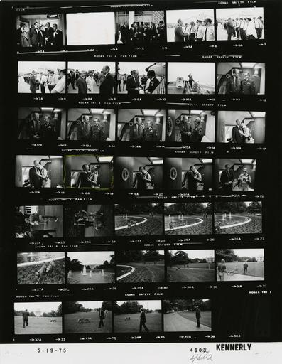 | Keywords: Ford A4602 NLGRF photo contact sheet (1975-05-18)(Gerald Ford Library).jpg White House Photographic Office WHPO is housed at the Gerald R Ford Presidential Library a branch of the National Archives and Records Administration NARA <br/><br/> This file is a 200 dpi photo contact sheet having images from roll of film A4602 of the August 9 1974 - January 20 1977 Gerald R Ford White House Photographic Office Series A0001-A9999 and B0001-B2886 photographs <br/><br/> The date on the photo contact sheet is the date the roll of film was processed not necessarily the date the photographs were taken See table below for additional details 1975-05-18 Gerald R Ford Presidential Library Image http //www fordlibrarymuseum gov/library/whphotos/A4602_NLGRF jpg A4602_NLGRF jpg from http //www fordlibrarymuseum gov/library/whphotos/19750518whpo pdf White House Photographs May 18 1975 of the http //www fordlibrarymuseum gov/Library/whphotos/whpo asp White House Photographic Collection page White House Photographic Office WHPO <br/> Creator David Hume Kennerly PD-USGov Institution Institution Gerald R Ford Presidential Library Table wikitable sortable + Photo contact sheet A4602 U S President Ford Administration Gerald R Ford Library Frame s Tone Subject proper Subject generic Names Geographic Location Photographer Date - 2A-4A BW Following Friends of Lubavitch Reception -Philadelphia Pennsylvania standing posing; second frame overexposed GRF Friends of Lubavitch Members Philadelphia PA Philadelphia Marriott Motor Hotel - Holding Room Kennerly 1975-05-18 - 5A-10A BW Prior to Departure from Philadelphia Pennsylvania greeting handshaking posing talking; all not in every frame; Air Force One in some frames GRF Police Officers Others Philadelphia PA Philadelphia International Airport Kennerly 1975-05-18 - 11A BW Prior to Departure from Philadelphia Pennsylvania waving from doorway of Air Force One GRF Philadelphia PA Philadelphia International Airport Kennerly 1975-05-18 - 12A-16A BW Return Flight From Philadelphia Pennsylvania to Andrews Air Force Base - Baggage Handler standing talking handshaking posing GRF MSG Herbert Oldenberg Air Force One - President's Cabin Kennerly 1975-05-18 - 17A-21A BW Return Flight From Philadelphia Pennsylvania to Andrews Air Force Base embracing; SF holding camera GRF Susan Ford Air Force One - President's Cabin Kennerly 1975-05-18 - 22A-23A BW Pet Golden Retrievers standing talking; dogs moving GRF Steve Ford Liberty Misty South Driveway Kennerly 1975-05-18 - 24A-28A BW Pet Golden Retrievers playing in water Liberty Misty South Lawn Fountain Kennerly 1975-05-18 - 29A-35A BW Pet Golden Retrievers dogs running; various angles and distances; all not in every frame; White House and Washington Monument in background GRF Steve Ford Liberty Misty Others South Lawn Kennerly 1975-05-18 Gerald R Ford Presidential Library and Museum-cooperation PD-USGov Contact sheets by the Ford White House May 1975 Photographs by David Hume Kennerly from 1975 |