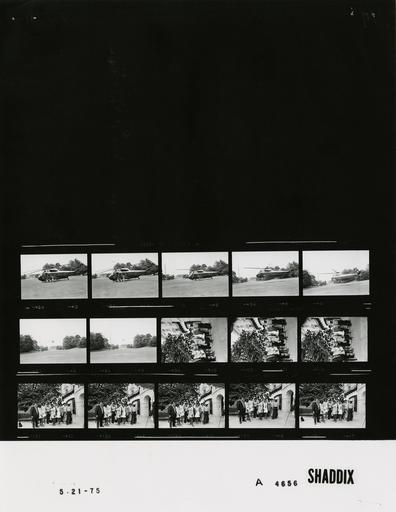 Keywords: Ford A4656 NLGRF photo contact sheet (1975-05-20)(Gerald Ford Library).jpg White House Photographic Office WHPO is housed at the Gerald R Ford Presidential Library a branch of the National Archives and Records Administration NARA <br/><br/> This file is a 200 dpi photo contact sheet having images from roll of film A4656 of the August 9 1974 - January 20 1977 Gerald R Ford White House Photographic Office Series A0001-A9999 and B0001-B2886 photographs <br/><br/> The date on the photo contact sheet is the date the roll of film was processed not necessarily the date the photographs were taken See table below for additional details 1975-05-20 Gerald R Ford Presidential Library Image http //www fordlibrarymuseum gov/library/whphotos/A4656_NLGRF jpg A4656_NLGRF jpg from http //www fordlibrarymuseum gov/library/whphotos/19750520whpo pdf White House Photographs May 20 1975 of the http //www fordlibrarymuseum gov/Library/whphotos/whpo asp White House Photographic Collection page White House Photographic Office WHPO - Shaddix PD-USGov Institution Institution Gerald R Ford Presidential Library Table wikitable sortable + Photo contact sheet A4656 U S President Ford Administration Gerald R Ford Library Frame s Tone Subject proper Subject generic Names Geographic Location Photographer Date - 2A-3A BW Prior to Departure for Andrews Air Force Base standing near Marine One taking photographs Kennerly Susan Ford South Lawn Shaddix 1975-05-20 - 4A-8A BW Departure for Andrews Air Force Base Marine One ascending flying; moving away from camera; Washington Monument in background South Lawn Shaddix 1975-05-20 - 9A-16A BW Choir Group From Jacksonville Florida standing posing on steps Calhoun Choir Group South Portico Shaddix 1975-05-20 Gerald R Ford Presidential Library and Museum-cooperation PD-USGov Contact sheets by the Ford White House May 1975 |