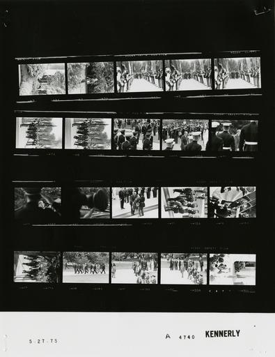 | Keywords: Ford A4740 NLGRF photo contact sheet (1975-05-26)(Gerald Ford Library).jpg White House Photographic Office WHPO is housed at the Gerald R Ford Presidential Library a branch of the National Archives and Records Administration NARA <br/><br/> This file is a 200 dpi photo contact sheet having images from roll of film A4740 of the August 9 1974 - January 20 1977 Gerald R Ford White House Photographic Office Series A0001-A9999 and B0001-B2886 photographs <br/><br/> The date on the photo contact sheet is the date the roll of film was processed not necessarily the date the photographs were taken See table below for additional details 1975-05-26 Gerald R Ford Presidential Library Image http //www fordlibrarymuseum gov/library/whphotos/A4740_NLGRF jpg A4740_NLGRF jpg from http //www fordlibrarymuseum gov/library/whphotos/19750526whpo pdf White House Photographs May 26 1975 of the http //www fordlibrarymuseum gov/Library/whphotos/whpo asp White House Photographic Collection page White House Photographic Office WHPO <br/> Creator David Hume Kennerly PD-USGov Institution Institution Gerald R Ford Presidential Library Table wikitable sortable + Photo contact sheet A4740 U S President Ford Administration Gerald R Ford Library Frame s Tone Subject proper Subject generic Names Geographic Location Photographer Date - 2-3 BW Prior to Departure for Memorial Day Ceremony walking toward driveway carrying speech GRF Sidewalk Between Oval Office and South Driveway Kennerly 1975-05-26 - 4-13 BW Memorial Day Wreath Laying at the Tomb of the Unknown Soldier - Arlington Virginia GRF and escort walking between Guard; reaching steps; GRF obscured by Guard in last 3 frames GRF Honor Guard Others Arlington VA Arlington National Cemetery -Steps at the Base of the Tomb of the Unknown Soldier Kennerly 1975-05-26 - 14-16 BW Memorial Day Wreath Laying at the Tomb of the Unknown Soldier - Arlington Virginia GRF placing wreath; GRF framed by Guard hand over heart in last frame GRF Honor Guard Others Arlington VA Arlington National Cemetery -Steps at the Base of the Tomb of the Unknown Soldier Kennerly 1975-05-26 - 17-20 BW Following Memorial Day Wreath Laying at the Tomb of the Unknown Soldier -Arlington Virginia walking to Amphitheater GRF Others Arlington VA Arlington National Cemetery Kennerly 1975-05-26 - 21 BW Memorial Day Ceremony Near the Tomb of the Unknown Soldier - Arlington Virginia seated; taken from right of podium GRF Veterans Guests Arlington VA Arlington National Cemetery -Amphitheater Kennerly 1975-05-26 Gerald R Ford Presidential Library and Museum-cooperation PD-USGov Contact sheets by the Ford White House May 1975 Photographs by David Hume Kennerly from 1975 |
