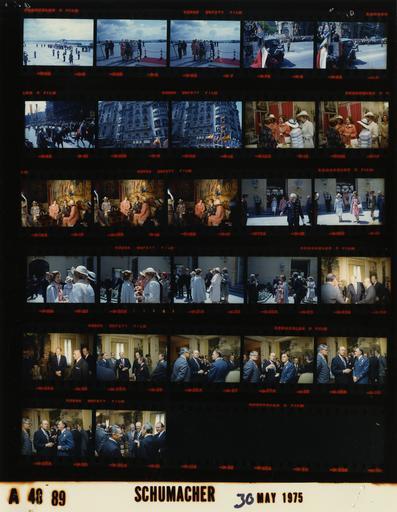 | Keywords: Ford A4889 NLGRF photo contact sheet (1975-05-31)(Gerald Ford Library).jpg White House Photographic Office WHPO is housed at the Gerald R Ford Presidential Library a branch of the National Archives and Records Administration NARA <br/><br/> This file is a 200 dpi photo contact sheet having images from roll of film A4889 of the August 9 1974 - January 20 1977 Gerald R Ford White House Photographic Office Series A0001-A9999 and B0001-B2886 photographs <br/><br/> The date on the photo contact sheet is the date the roll of film was processed not necessarily the date the photographs were taken See table below for additional details 1975-05-31 Gerald R Ford Presidential Library Image http //www fordlibrarymuseum gov/library/whphotos/A4889_NLGRF jpg A4889_NLGRF jpg from http //www fordlibrarymuseum gov/library/whphotos/19750531whpo pdf White House Photographs May 31 1975 of the http //www fordlibrarymuseum gov/Library/whphotos/whpo asp White House Photographic Collection page White House Photographic Office WHPO - Schumacher PD-USGov Institution Institution Gerald R Ford Presidential Library Table wikitable sortable + Photo contact sheet A4889 U S President Ford Administration Gerald R Ford Library Frame s Tone Subject proper Subject generic Names Geographic Location Photographer Date - 4A-6A Color Trip to Spain - Arrival in Madrid standing in group; Air Force One in background in first frame Betty Ford Carmen Franco Others Madrid Spain Barajas Airport Schumacher 1975-05-31 - 7A-11A Color Trip to Spain - Ceremonial Parade to the Moncloa Palace views of media filming parade public in buildings watching parade guards mounted on horses in parade Media crowd mounted ceremonia guard Madrid Spain Ceremonial Parade Route Schumacher 1975-05-31 - 12A-13A Color Trip to Spain - Meeting with Wife of Generalissimo Franco standing talking Betty Ford Carmen Franco Others Madrid Spain El Pardo Palace Schumacher 1975-05-31 - 14A-16A Color Trip to Spain - Meeting with Wife of Generalissimo Franco seated under tapestry; talking Betty Ford Carmen Franco Others Madrid Spain El Pardo Palace Schumacher 1975-05-31 - 17A-22A Color Trip to Spain - Following Meeting with Wife of Generalissimo Franco standing talking; all not in every frame Betty Ford Carmen Franco Others Madrid Spain El Pardo Palace - Outside Schumacher 1975-05-31 - 23A-30A Color Trip to Spain - Reception For U S and Spanish Officials greeting handshaking; all not in every frame GRF Carlos Arias Navaero; Others Madrid Spain Moncloa Palace - Salon de Cafe Schumacher 1975-05-31 Gerald R Ford Presidential Library and Museum-cooperation PD-USGov Contact sheets by the Ford White House May 1975 |