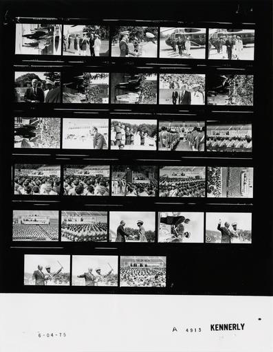 | Keywords: Ford A4913 NLGRF photo contact sheet (1975-06-04)(Gerald Ford Library).jpg White House Photographic Office WHPO is housed at the Gerald R Ford Presidential Library a branch of the National Archives and Records Administration NARA <br/><br/> This file is a 200 dpi photo contact sheet having images from roll of film A4913 of the August 9 1974 - January 20 1977 Gerald R Ford White House Photographic Office Series A0001-A9999 and B0001-B2886 photographs <br/><br/> The date on the photo contact sheet is the date the roll of film was processed not necessarily the date the photographs were taken See table below for additional details 1975-06-04 Gerald R Ford Presidential Library Image http //www fordlibrarymuseum gov/library/whphotos/A4913_NLGRF jpg A4913_NLGRF jpg from http //www fordlibrarymuseum gov/library/whphotos/19750604whpo pdf White House Photographs June 4 1975 of the http //www fordlibrarymuseum gov/Library/whphotos/whpo asp White House Photographic Collection page White House Photographic Office WHPO <br/> Creator David Hume Kennerly PD-USGov Institution Institution Gerald R Ford Presidential Library Table wikitable sortable + Photo contact sheet A4913 U S President Ford Administration Gerald R Ford Library Frame s Tone Subject proper Subject generic Names Geographic Location Photographer Date - 1A-6A BW Arrival for U S Military Academy 1975 Commencement; Commandant; First Cadet; President of the 1975 Class - West Point New York greeting handshaking walking from Marine One helicopter; all not in every frame GRF Lt Gen Berry; Cadet James Abcouwer Cadet Robert Wesley Hayes; Others West Point NY United States Military Academy Kennerly 1975-06-04 - 7A-12A BW Arrival for U S Military Academy 1975 Commencement; Commandant; First Cadet; President of the 1975 Class - West Point New York walking into stadium moving toward platform; all not in every frame GRF Lt Gen Berry; Cadet James Abcouwer Cadet Robert Wesley Hayes; Others West Point NY United States Military Academy - Michie Stadium Kennerly 1975-06-04 - 13A BW U S Military Academy 1975 Commencement - West Point New York standing for anthem; GRF with hand over heart; military saluting GRF Platform Guests West Point NY United States Military Academy - Michie Stadium Kennerly 1975-06-04 - 14A-22A BW U S Military Academy 1975 Commencement - West Point New York GRF at podium others seated; various angles and distances GRF Platform Guests Cadets Guests West Point NY United States Military Academy - Michie Stadium Kennerly 1975-06-04 - 23A-27A BW U S Military Academy 1975 Commencement; Presentation of Diploma to Last Cadet - West Point New York greeting handshaking presenting diploma GRF Cadet Eugene Emmett Shaw Jr West Point NY United States Military Academy - Michie Stadium Kennerly 1975-06-04 - 28A BW U S Military Academy 1975 Commencement - West Point New York long shot from behind cadets GRF Platform Guests Cadets Guests West Point NY United States Military Academy - Michie Stadium Kennerly 1975-06-04 Gerald R Ford Presidential Library and Museum-cooperation PD-USGov Contact sheets by the Ford White House June 1975 Photographs by David Hume Kennerly from 1975 |