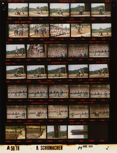 Keywords: Ford A5078 NLGRF photo contact sheet (1975-06-14)(Gerald Ford Library).jpg White House Photographic Office WHPO is housed at the Gerald R Ford Presidential Library a branch of the National Archives and Records Administration NARA <br/><br/> This file is a 200 dpi photo contact sheet having images from roll of film A5078 of the August 9 1974 - January 20 1977 Gerald R Ford White House Photographic Office Series A0001-A9999 and B0001-B2886 photographs <br/><br/> The date on the photo contact sheet is the date the roll of film was processed not necessarily the date the photographs were taken See table below for additional details 1975-06-14 Gerald R Ford Presidential Library Image http //www fordlibrarymuseum gov/library/whphotos/A5078_NLGRF jpg A5078_NLGRF jpg from http //www fordlibrarymuseum gov/library/whphotos/19750614whpo pdf White House Photographs June 14 1975 of the http //www fordlibrarymuseum gov/Library/whphotos/whpo asp White House Photographic Collection page White House Photographic Office WHPO - Schumacher PD-USGov Institution Institution Gerald R Ford Presidential Library Table wikitable sortable + Photo contact sheet A5078 U S President Ford Administration Gerald R Ford Library Frame s Tone Subject proper Subject generic Names Geographic Location Photographer Date - 2-4 Color Trip to Georgia - 200th Anniversary of the U S Army Infantry - Columbus Georgia walking entering area; seated in grandstands watching demonstration not shown in last frame; all not in every frame GRF Callaway O'Donnell Cheney Military Officers Enlisted Men Guests Columbus GA Fort Benning -Victory Pond Schumacher 1975-06-14 - 5-12 Color Trip to Georgia - 200th Anniversary of the U S Army Infantry - Columbus Georgia giving hand-to-hand combat demonstrations Army Rangers Columbus GA Fort Benning -Victory Pond Schumacher 1975-06-14 - 13-21 Color Trip to Georgia - 200th Anniversary of the U S Army Infantry - Columbus Georgia seated in grandstands watching demonstration not shown ; various distances; all not in every frame GRF Callaway Military Officers Enlisted Men Guests Columbus GA Fort Benning -Victory Pond Schumacher 1975-06-14 - 22-35 Color Trip to Georgia - 200th Anniversary of the U S Army Infantry - Columbus Georgia giving hand-to-hand combat demonstrations; GRF and others in grandstands in background in some frames Army Rangers Columbus GA Fort Benning -Victory Pond Schumacher 1975-06-14 Gerald R Ford Presidential Library and Museum-cooperation PD-USGov Contact sheets by the Ford White House June 1975 |