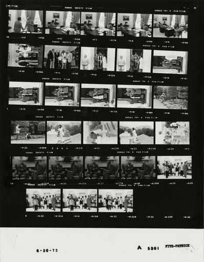 | Keywords: Ford A5301 NLGRF photo contact sheet (1975-06-28)(Gerald Ford Library).jpg  White House Photographic Office WHPO is housed at the Gerald R Ford Presidential Library a branch of the National Archives and Records Administration NARA <br/><br/> This file is a 200 dpi photo contact sheet having images from roll of film A5301 of the August 9 1974 - January 20 1977 Gerald R Ford White House Photographic Office Series A0001-A9999 and B0001-B2886 photographs <br/><br/> The date on the photo contact sheet is the date the roll of film was processed not necessarily the date the photographs were taken See table below for additional details 1975-06-28 Gerald R Ford Presidential Library Image http //www fordlibrarymuseum gov/library/whphotos/A5301_NLGRF jpg A5301_NLGRF jpg from http //www fordlibrarymuseum gov/library/whphotos/19750628whpo pdf White House Photographs June 28 1975 of the http //www fordlibrarymuseum gov/Library/whphotos/whpo asp White House Photographic Collection page White House Photographic Office WHPO - Fitz-Patrick PD-USGov Institution Institution Gerald R Ford Presidential Library Table wikitable sortable + Photo contact sheet A5301 U S President Ford Administration Gerald R Ford Library Frame s Tone Subject proper Subject generic Names Geographic Location Photographer Date - 5-9 BW Meeting on President's Crime Message - Executive Director National Legal Data Center on the Law of Obscenity greeting handshaking in 1st frame; seated around desk in remaining frames; Buchen in last frame; various angles and distances GRF Philip Cohen Oval Office Fitz-Patrick 1975-06-28 - 10-11 BW Brazilian Soccer Player standing posing with WH staff Pele Others Children White House Fitz-Patrick 1975-06-28 - 12-18 BW Following Sunday Worship Services handshaking in doorway; Secret Service in foreground in some frames GRF Betty Ford Clergy Washington DC St John's Episcopal Church - Lafayette Square Fitz-Patrick 1975-06-29 - 19-20 BW White House Support Staff bending pruning plants; another man taking motes in 2nd frame White House Gardener Rose Garden Fitz-Patrick 1975-06-29 - 21-24 BW White House Support Staff scraping paint off chimney; all not in every frame Painters White House Roof Fitz-Patrick 1975-06-29 - 25-28 BW Administrator Energy Research and Development Agency ERDA seated talking near fireplace GRF Robert Seamans Oval Office Fitz-Patrick 1975-06-30 - 29-32 BW Farewell Visit with Departing Residence Doorman standing posing GRF Preston Bruce Sr Mr Mrs Preston Bruce Jr ; Preston Bruce III Kellene Bruce; Judge Mrs William Pryor; Billy Stephen Pryor Oval Office Fitz-Patrick 1975-06-30 Gerald R Ford Presidential Library and Museum-cooperation PD-USGov Contact sheets by the Ford White House June 1975  |