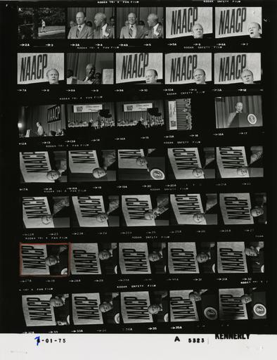| Keywords: Ford A5323 NLGRF photo contact sheet (1975-07-01)(Gerald Ford Library).jpg White House Photographic Office WHPO is housed at the Gerald R Ford Presidential Library a branch of the National Archives and Records Administration NARA <br/><br/> This file is a 200 dpi photo contact sheet having images from roll of film A5323 of the August 9 1974 - January 20 1977 Gerald R Ford White House Photographic Office Series A0001-A9999 and B0001-B2886 photographs <br/><br/> The date on the photo contact sheet is the date the roll of film was processed not necessarily the date the photographs were taken See table below for additional details 1975-07-01 Gerald R Ford Presidential Library Image http //www fordlibrarymuseum gov/library/whphotos/A5323_NLGRF jpg A5323_NLGRF jpg from http //www fordlibrarymuseum gov/library/whphotos/19750701whpo pdf White House Photographs July 1 1975 of the http //www fordlibrarymuseum gov/Library/whphotos/whpo asp White House Photographic Collection page White House Photographic Office WHPO <br/> Creator David Hume Kennerly PD-USGov Institution Institution Gerald R Ford Presidential Library Table wikitable sortable + Photo contact sheet A5323 U S President Ford Administration Gerald R Ford Library Frame s Tone Subject proper Subject generic Names Geographic Location Photographer Date - 3 BW walking toward driveway; carrying papers GRF Sidewalk from Oval Office to South Driveway Kennerly 1975-07-01 - 4-5 BW 66th Annual Convention of the National Association for the Advancement of Colored People NAACP seated talking; close up GRF Roy Wilkins Washington DC Sheraton Park Hotel - Ballroom Kennerly 1975-07-01 - 6-36 BW 66th Annual Convention of the National Association for the Advancement of Colored People NAACP at podium; various angles and distances mostly close ups; large NAACP banner in background in most frames GRF Washington DC Sheraton Park Hotel - Ballroom Kennerly 1975-07-01 Gerald R Ford Presidential Library and Museum-cooperation PD-USGov Contact sheets by the Ford White House July 1975 NAACP ¢ Roy Wilkins ¢ Photographs by David Hume Kennerly from 1975 |