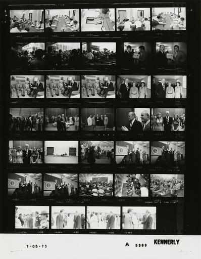 | Keywords: Ford A5388 NLGRF photo contact sheet (1975-07-03)(Gerald Ford Library).jpg White House Photographic Office WHPO is housed at the Gerald R Ford Presidential Library a branch of the National Archives and Records Administration NARA <br/><br/> This file is a 200 dpi photo contact sheet having images from roll of film A5388 of the August 9 1974 - January 20 1977 Gerald R Ford White House Photographic Office Series A0001-A9999 and B0001-B2886 photographs <br/><br/> The date on the photo contact sheet is the date the roll of film was processed not necessarily the date the photographs were taken See table below for additional details 1975-07-03 Gerald R Ford Presidential Library Image http //www fordlibrarymuseum gov/library/whphotos/A5388_NLGRF jpg A5388_NLGRF jpg from http //www fordlibrarymuseum gov/library/whphotos/19750703whpo pdf White House Photographs July 3 1975 of the http //www fordlibrarymuseum gov/Library/whphotos/whpo asp White House Photographic Collection page White House Photographic Office WHPO <br/> Creator David Hume Kennerly PD-USGov Institution Institution Gerald R Ford Presidential Library Table wikitable sortable + Photo contact sheet A5388 U S President Ford Administration Gerald R Ford Library Frame s Tone Subject proper Subject generic Names Geographic Location Photographer Date - 3A-7A BW Trip to Ohio -Meeting with the Citizens Committee on Environmental Quality - Cincinnati Ohio seated around table talking; all not in frame GRF Train Environmentlists Cincinnati OH National Environmental Research Center -Conference Room Kennerly 1975-07-03 - 8A-10A BW Trip to Ohio -Following Ohio River Valley White House Conference on Domestic and Economic Affairs - Cincinnati Ohio greeting handshaking mingling; all not in every frame; various angles and distances GRF Crowd Cincinnati OH Stouffer's Inn - Outside Kennerly 1975-07-03 - 11A-12A BW Trip to Ohio -Prior to Ohio River Valley White House Conference on Domestic and Economic Affairs - Cincinnati Ohio GRF receiving an award GRF Unidentified Man Cincinnati OH Stouffer's Inn Kennerly 1975-07-03 - 13A-15A BW Trip to Ohio -Prior to Ohio River Valley White House Conference on Domestic and Economic Affairs - Cleveland Ohio seated talking GRF Three Unidentified Man Cleveland OH Stouffer's Inn - VIP Room 214 Kennerly 1975-07-03 - 16A-21A BW Trip to Ohio -Reception Preceding the Ohio River Valley White House Conference on Domestic and Economic Affairs - Cleveland Ohio standing talking posing; all not in every frame GRF Others Cleveland OH Stouffer's Inn - VIP Room 214 Kennerly 1975-07-03 - 22A-23A BW Trip to Ohio -Prior to Ohio River Valley White House Conference on Domestic and Economic Affairs - Cincinnati Ohio standing posing GRF Two Young Women Cincinnati OH Stouffer's Inn Kennerly 1975-07-03 - 24A BW Trip to Ohio -Prior to Ohio River Valley White House Conference on Domestic and Economic Affairs - Cincinnati Ohio seated alone in large room GRF Cincinnati OH Stouffer's Inn Kennerly 1975-07-03 - 25A-32A BW Trip to Ohio -Ohio River Valley White House Conference on Domestic and Economic Affairs - Cincinnati Ohio various activities; all not in every frame; various angles and distances GRF Participants Audience Cincinnati OH Stouffer's Inn - Conference Room Kennerly 1975-07-03 - 33A-36A BW Trip to Ohio -Prior to Departure for Cleveland - Cincinnati Ohio greeting handshaking saying goodbye GRF Police Officers Others Cincinnati OH Greater Cincinnati Airport Kennerly 1975-07-03 Gerald R Ford Presidential Library and Museum-cooperation PD-USGov Contact sheets by the Ford White House July 1975 Photographs by David Hume Kennerly from 1975 |