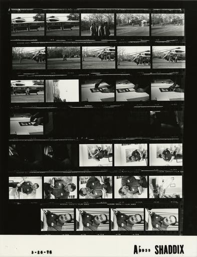 | Keywords: Ford A8939 NLGRF photo contact sheet (1976-03-26)(Gerald Ford Library).jpg White House Photographic Office WHPO is housed at the Gerald R Ford Presidential Library a branch of the National Archives and Records Administration NARA <br/><br/> This file is a 200 dpi photo contact sheet having images from roll of film A8939 of the August 9 1974 - January 20 1977 Gerald R Ford White House Photographic Office Series A0001-A9999 and B0001-B2886 photographs <br/><br/> The date on the photo contact sheet is the date the roll of film was processed not necessarily the date the photographs were taken See table below for additional details 1976-03-26 Gerald R Ford Presidential Library Image http //www fordlibrarymuseum gov/library/whphotos/A8939_NLGRF jpg A8939_NLGRF jpg from http //www fordlibrarymuseum gov/library/whphotos/19760326whpo pdf White House Photographs March 26 1976 of the http //www fordlibrarymuseum gov/Library/whphotos/whpo asp White House Photographic Collection page White House Photographic Office WHPO - Shaddix PD-USGov Institution Institution Gerald R Ford Presidential Library Table wikitable sortable + Photo contact sheet A8939 U S President Ford Administration Gerald R Ford Library Frame s Tone Subject proper Subject generic Names Geographic Location Photographer Date - 4-15 BW Campaign Trip to California-White House Departure; Marine One helicopter on grass press shooting GRF Secret Service walking across grass; ascending helicopter; helicopter rising Marine One; Media; GRF Pontius Kennerly South Lawn Shaddix 1976-03-26 - 16-37 BW GSA Staff at work; Christmas Cards GSA employee in uniform working with tools to matte and frame Christmas cards; close up L Benecik Unidentified Work Room Shaddix 1976-03-26 Gerald R Ford Presidential Library and Museum-cooperation PD-USGov Contact sheets by the Ford White House March 1976 |